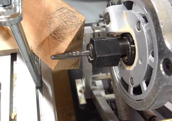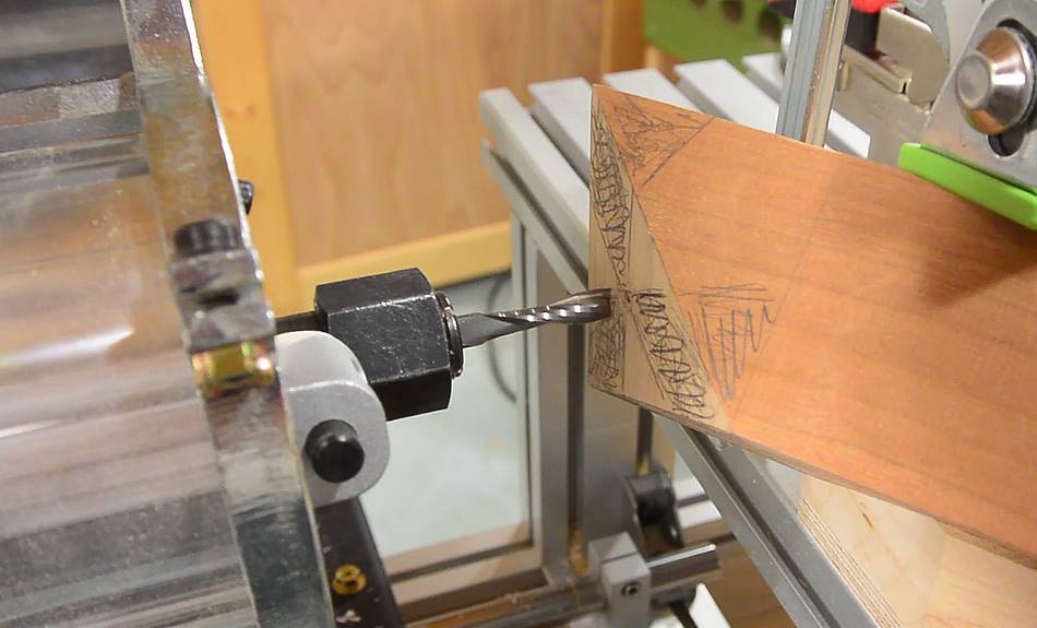 Lining up the bit with the middle of the pattern. The stock is on a 45-degree