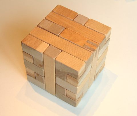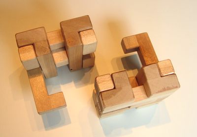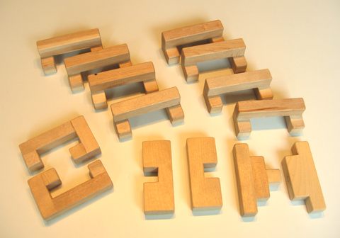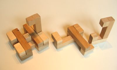 To assemble this puzzle, make two of the shapes shown at left in the photo.
