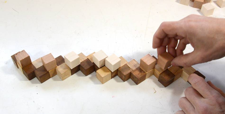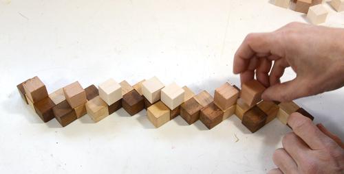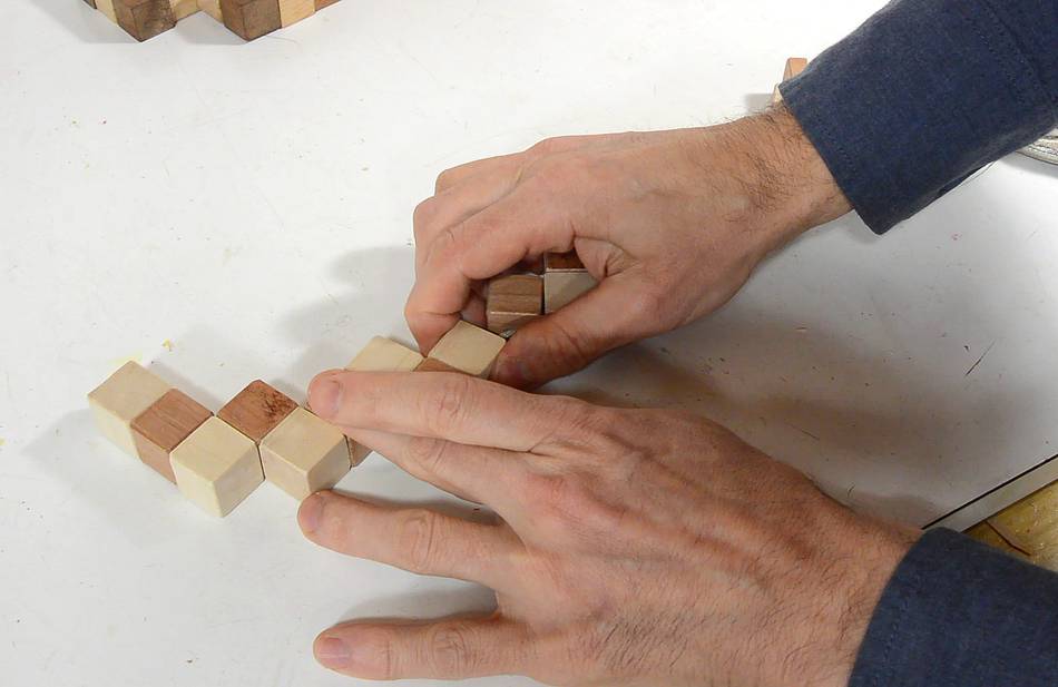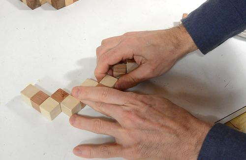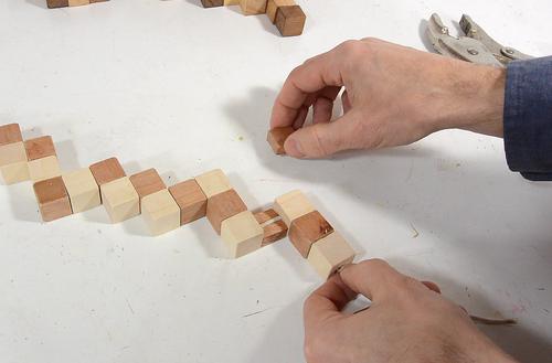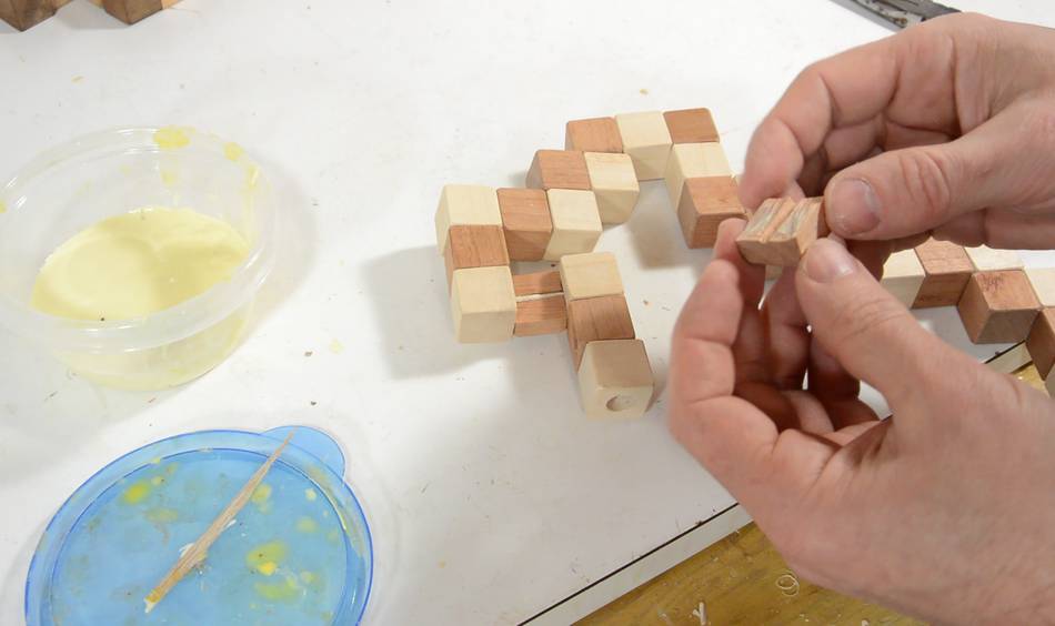 So I figured this would be a good puzzle to figure out how to make. The cubes are held together by a string that is stretched through holes along the length of the "snake".