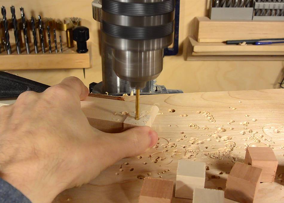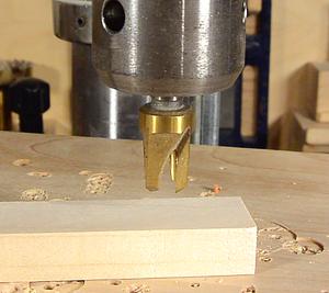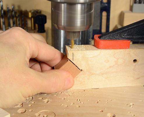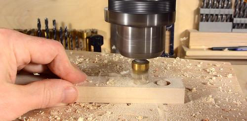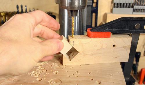 I made a simple jig to help line things up. The jig holds the workpiece and the drill.