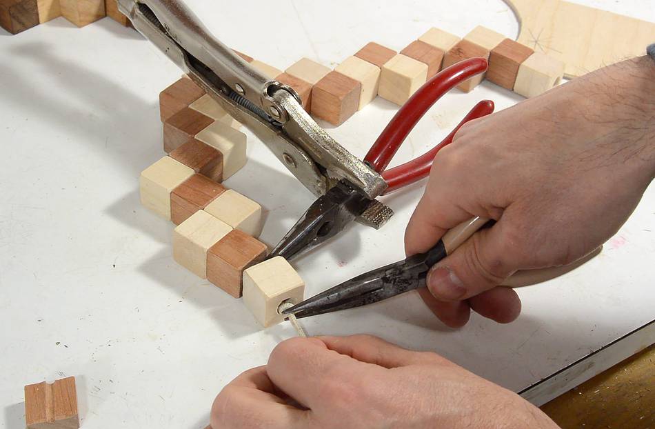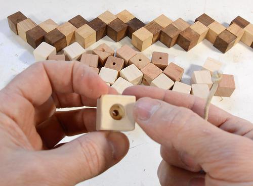 Threading up the cubes. With the diagonal holes, the corner cubes were as easy to