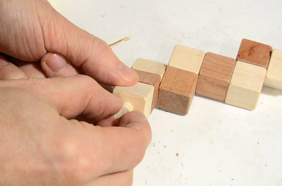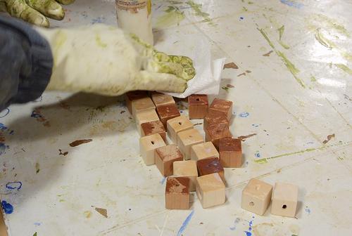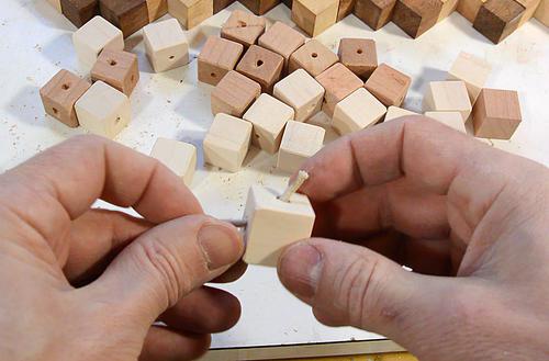 If I was doing it again, I'd varnish the cubes before drilling. Better yet, I'd varnish the square sticks before cutting cubes out of them so that I'd only have to varnish the end-grain faces.