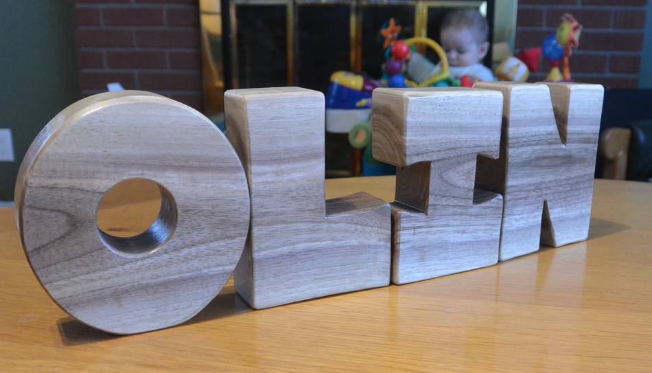 wooden letters of his name (Olin).