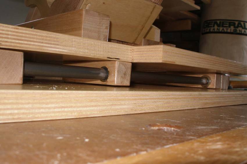 I knew you would ask about the bushing. And yes there is some binding, but there is no play though. I have a small amount of play in the slot mortising machine. For now, I'd rather use the slot mortising machine for mortises because it's easier to set up and I can do both tennons and mortises at the same time, at the same place by flipping the stand which supports both machines. After building my first pivoting stand for my planer and drum sander, I built another one for the mortising machine and the pantorouter. The flip locking pin of the stand. I modified the pantorouter slightly by putting the handle on the other side. This allows me to switch tools and have both handles on the same side. I had to build those stands because my shop is ridiculously small. This way I can pack two tools in the same spot. My original proof of concept also had the handle on the right side to match the slot mortiser, but because the pantorouter is operated with both hands, I figured it made more to use the right hand for the main handle, so I moved the handles to the left.