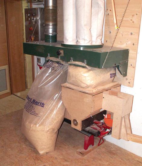 With so many chips from jointing and planing I had to attach an additional chip bag to my dust collector. So much at once is too much for my briquette press.