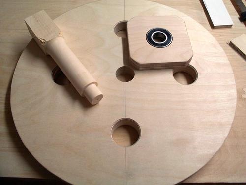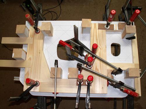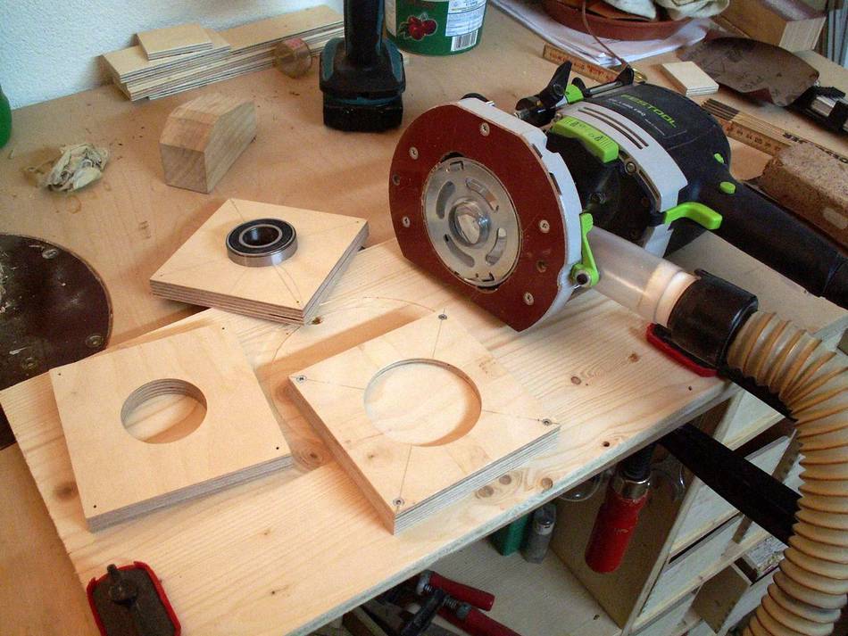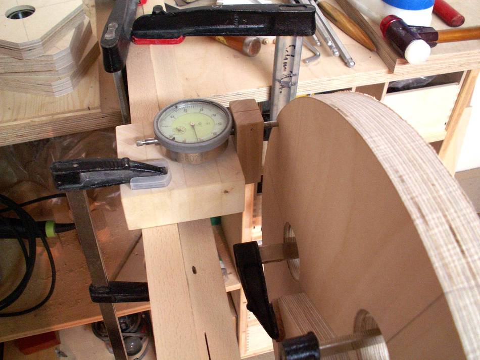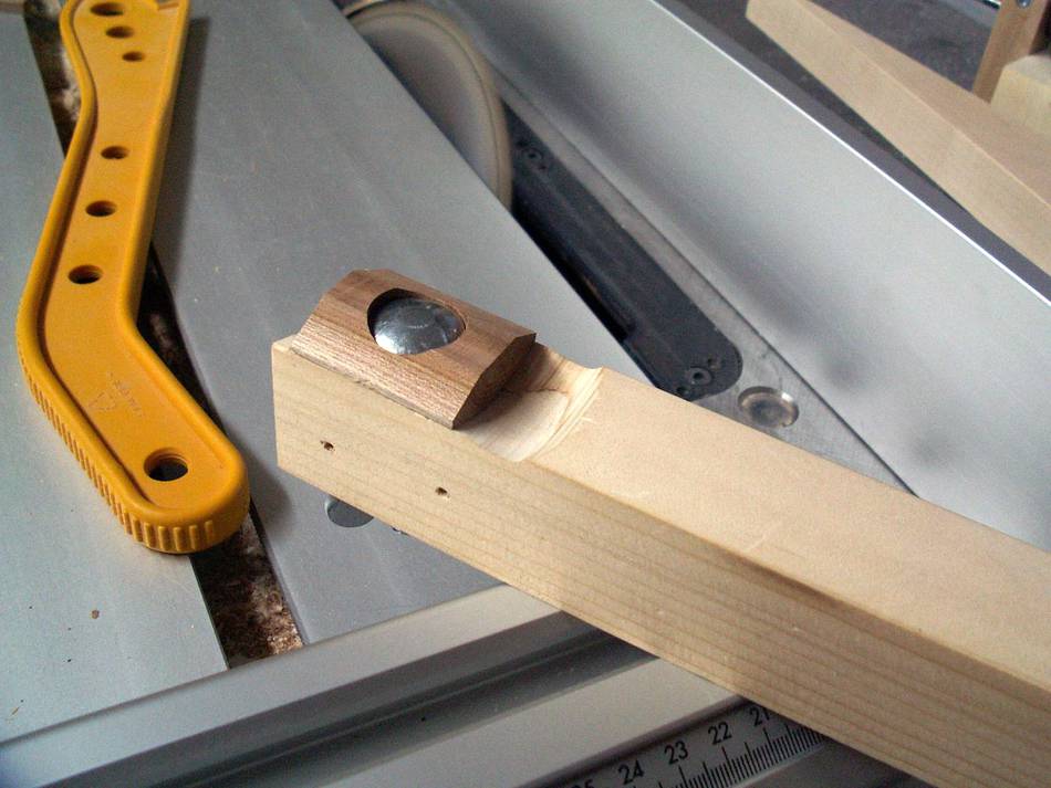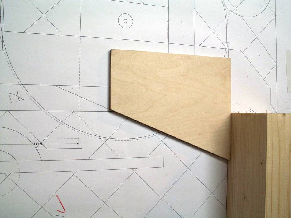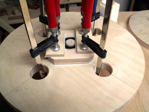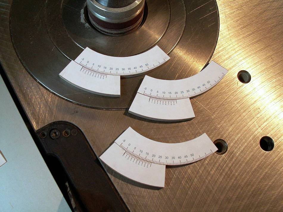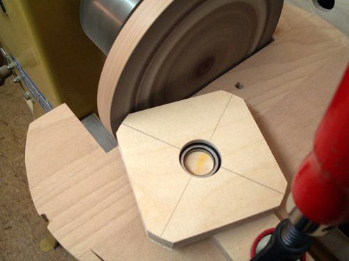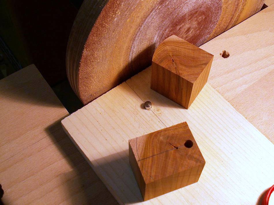 Since I don't have a decent hand plane, I made a sanding block and used that to ensure that all front faces were at the right angle. The round part of the clamping plates were shaped on the disk sander, rotating around on the peg. I made a holder out of wood for cutting the other side on the table saw.
