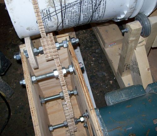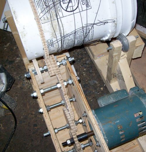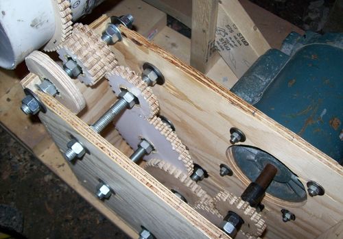 Michael writes: "This design has turned out rather well. Those are steel bearings in the center of each gear. They are held in by a press fit (forstner bit with a bit of tape around the bearing). They hold up to wear pretty well. I have had this on running for a total of about 4 hours, so it is just getting broken in. The gears exhibit no signs of wear unless the mass inside the ball mill container is too great." I love this application. This is the first time I have seen this type of plywood gears seen in a real power application. So far, I have only used plywood gears for hand-cranked applications, such as this router lift, where wear has never been a factor.
