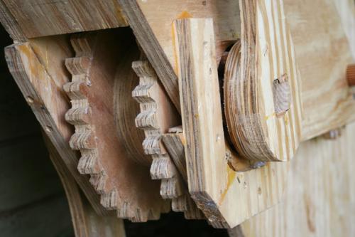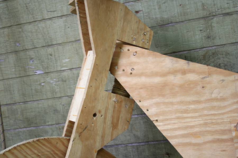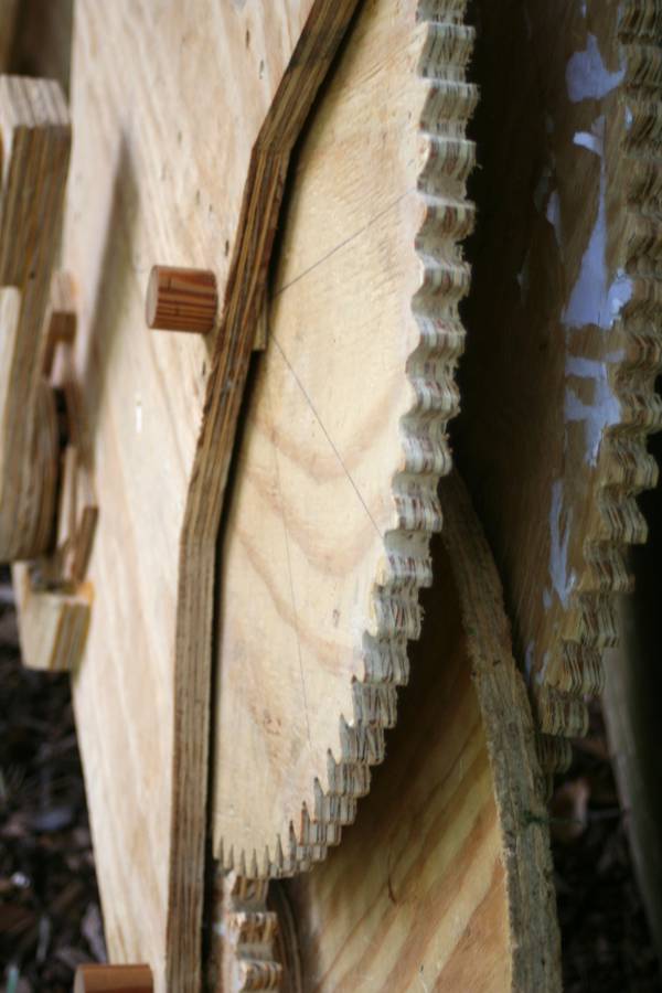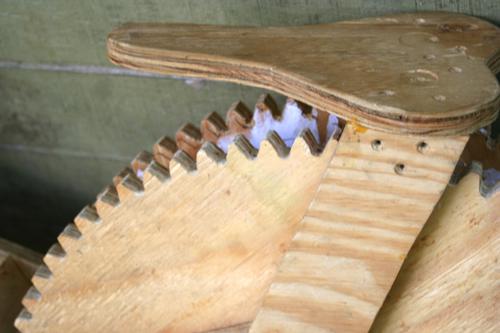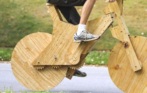 Collin continues: The bike has 6 gears: 2 with 28 teeth, 2 with 72 and 2 with 21. It weights 71 lbs. The total material cost is about $30 and the bike is now on its 6th set of gears after traveling about 20 miles. Also here is the link to an article on the bike by a local newspaper http://www.ajc.com/news/lifestyles/avondale-teen-builds-wooden-bike/nRMRc/ I noticed the bike in the newspaper article and YouTube video had a different gear train (see picture at left) and asked Collin about that. His reply: That was the original design when it had bolts, screws and bearings. The middle gear in the drive train had 28 teeth and the bolt that served as an axle was supported on one side by the outside frame and on the other by a small piece of plywood that was inserted between the gear and then wheel. The large gears eliminate the need for the insert. I added the second drive train as a safety precaution after the single drive train (and my only way to brake) tore up on a hill.
