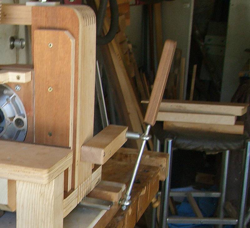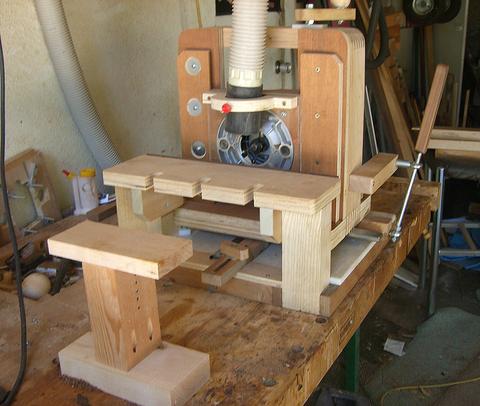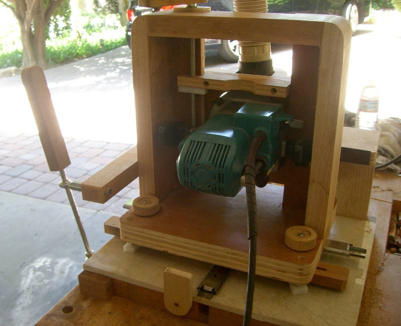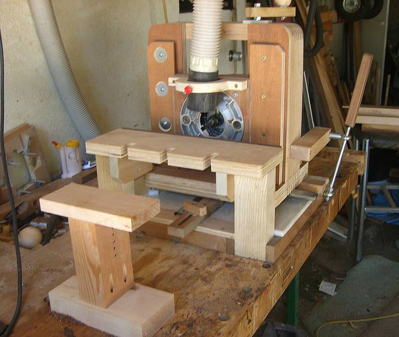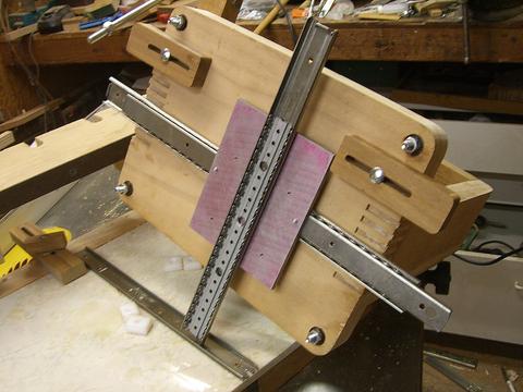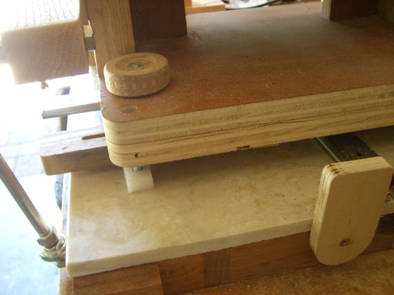 Dan Cameron sent me some pictures of his slot mortiser, inspired by my design, but with a few interesting changes to it. Dan writes: I have constructed a slot mortiser inspired by your design, and I thought you might be interested in some of the details.... ... the x/y motion is implemented by the use of a single pair of drawer slides and four UHMW sliders riding on a 1/2 inch thick granite tile. The slides were (I think) 24" and I cut them to 18" and 14" Actually, they were both both part of a double extension slide that I drilled out the welds to separate. The theory here is that the tile is polished essentially dead-flat, and the sliders pull upwards on the drawer slides to eliminate virtually all of the free play in their motion. The drawer slides, in turn, hold the sliders down flat on the granite (along with gravity). Vertical motion uses a wooden dovetail mechanism. The sliding surfaces are lined with a single layer of UHMW tape. One side of the dovetail saddle is adjustable for sliding tension. The body of the router is a very strange shape, so I hung it from the plunge base with an acrylic sub-base and a tight fitting circular hole in a piece of plywood. A note on the threaded rod vertical control. I did not use a t-nut. Rather, I threaded a block of UHMW (or may be it was HDPE) using an undersized pilot hole. The plastic stretches as you tap it, resulting in a friction inducing, low backlash thread. The crank is not all that hard to turn and it stays put. I learned this when I built my screw advance box joint jig. For the single handle control arm I used a pair of rod end (Heim joint) fittings and a long 3/8 inch bolt with the head removed. More Reader projects