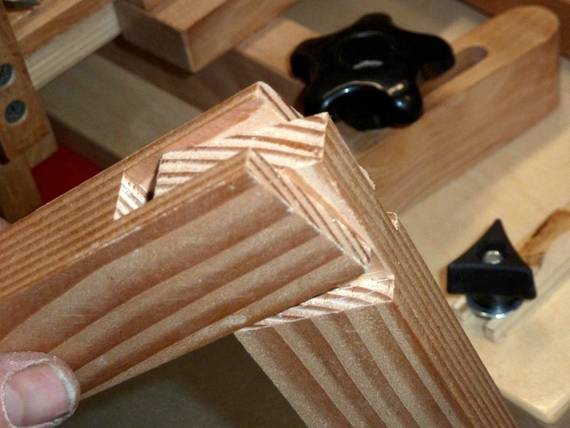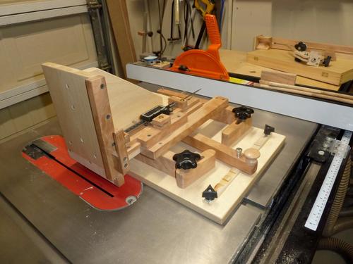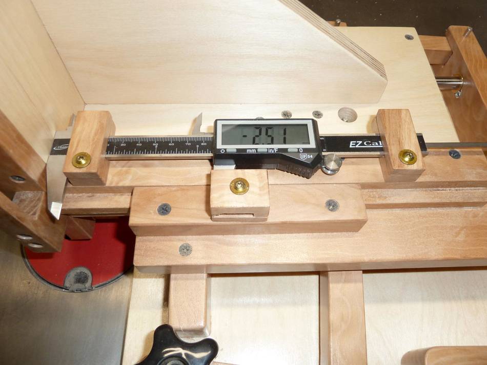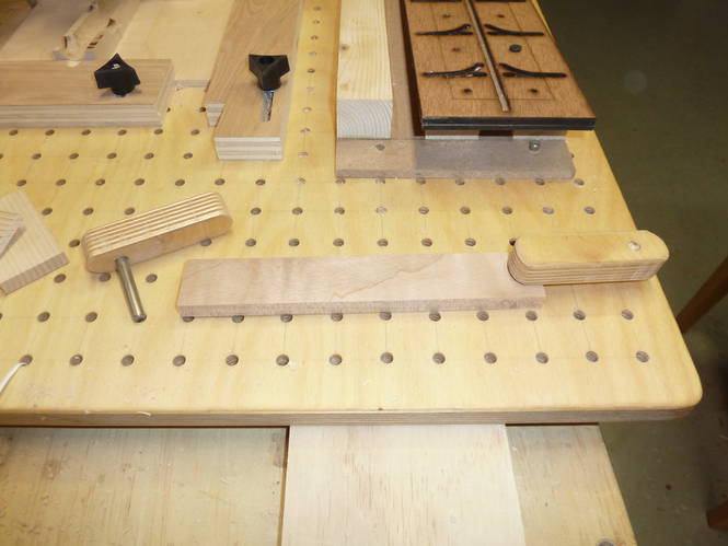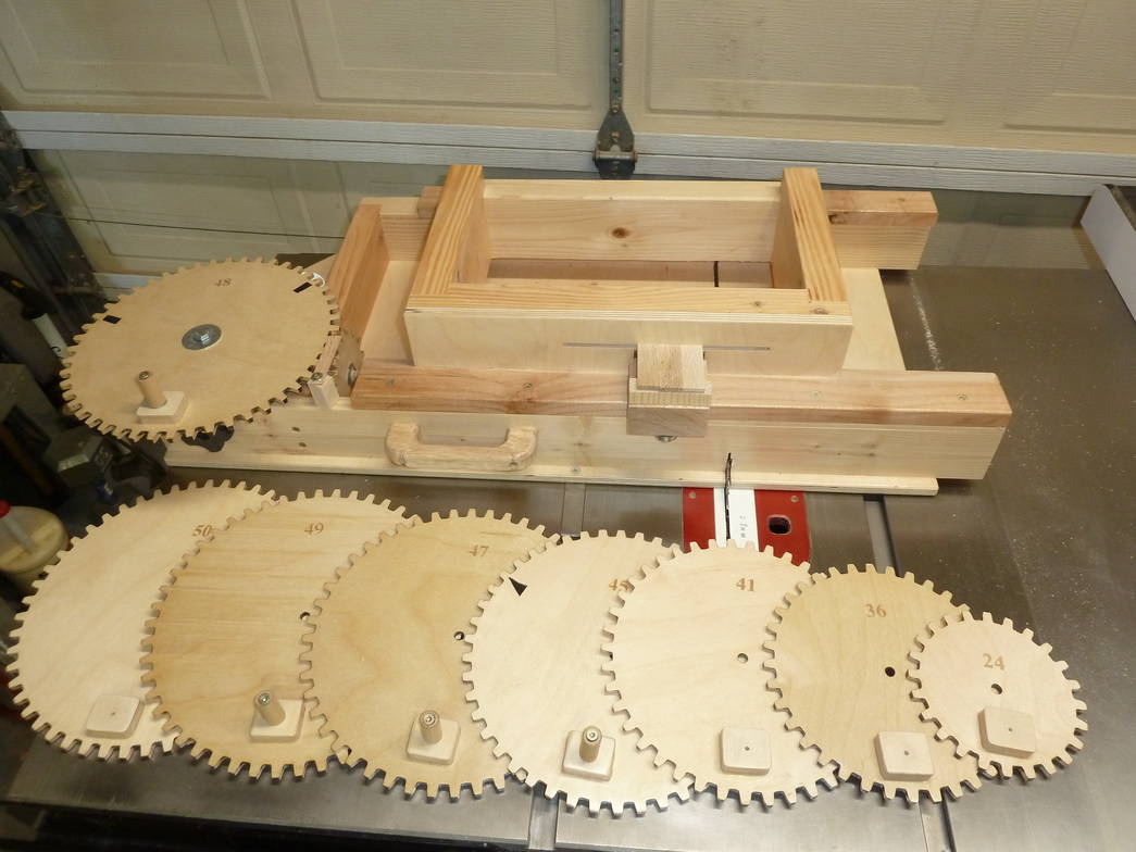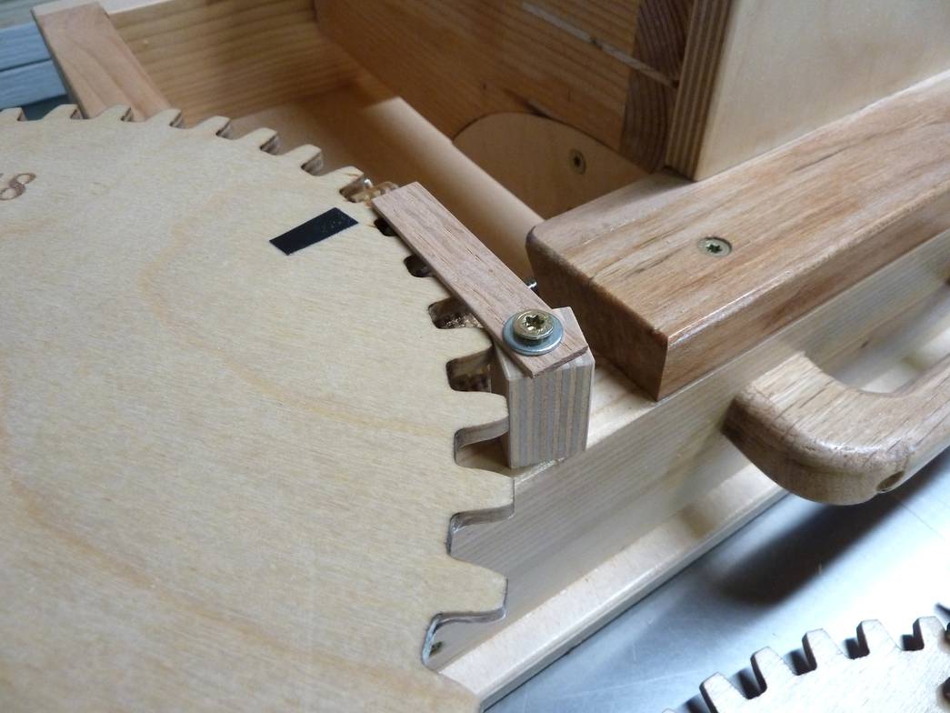 Screw advance box joint jigThe Screw advance box joint jig was very handy for cutting the finger joints on the pantorouter. I also used it to make shelf brackets to store the pantorouter. The main gears are cut by hand. I made the crank gears with a laser cutter and gave the teeth a bevel on the belt sander afterwards. The laser cutter is limited to 6mm, but that seems to be thick enough. I have not had any problems so far. A small piece of wood serves as a point of reference when cranking to marked positions on the wheels. I tried to be clever and used bamboo for the gear handles. They already have a hole for the screw. But since the hole is too big and not countersunk they are actually not as nice as handles made from a normal dowel.
