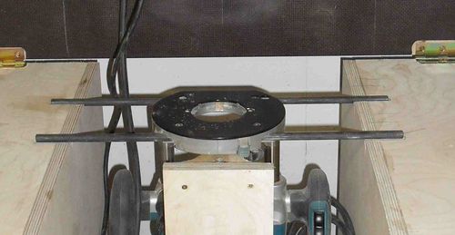The router itself is not permanently mounted into the cabinet. Two steel rods