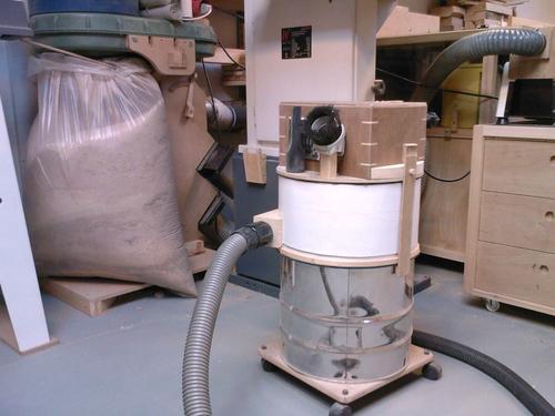Jens Larsen's dust extractor Thien-baffle modificationsJens Larsen writes: I recently renovated my shop and have, among other things, improved my dust extractor and shop-vac, both of which I have equipped with a Thien baffle. In case you haven’t heard of this, I recommend you look it up for they can work very well indeed. I found out about the principle by chance when I was searching for information on cyclones on the net, and was taken in by the simplicity of the thing and the claims of how well it works, and started experimenting with it on my dust extractor.