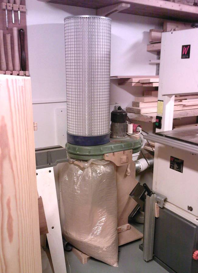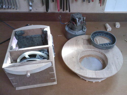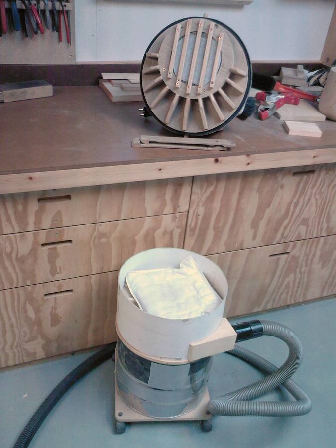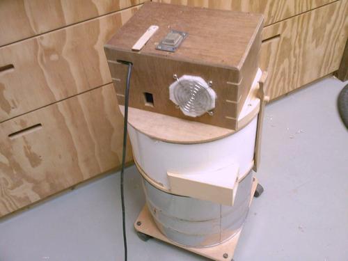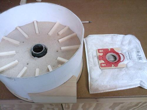 With that I can now fill a bin-bag with shavings, sawdust and/or dust from the sander with little or next to no dust residue on the filter, and consequently no discernible loss of suction efficiency. While renovating the shop I moved the thing nearer the machines and installed the simple manifold with a two-way valve that can be seen in the first picture. This is not very efficient aerodynamically, but easy to make, and it was the only way I could find to make room for that many outlets. Thien baffle shop-vac modificationHaving seen how efficient a Thien baffle arrangement could be, I set about modifying my shop-vac as well. The easiest would have been to install the Thien-baffle in a separate bucket and hook this up to the shop-vac, but I found that arrangement would be cumbersome and inelegant.I thought an alternative would be to have a small bag chamber and an inlet chamber with a Thien baffle in a ring inserted between the bucket and the motor unit. And I would have easily done this had I not ruined the fan on the shop-vac while testing. So I ended up having to build a base and enclosure for a salvaged domestic vacuum cleaner motor instead. Not bad really. The motor from that vacuum cleaner is a good deal less noisy, and it came with a spring loaded cable winding reel that I also reused. The arrangement works quite well. There is very little dust in the bag, even after the bucket has been filled 3-4 times. So there is little or no loss of suction power. Well worth the effort, and with a coat of paint it might even look half decent.