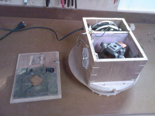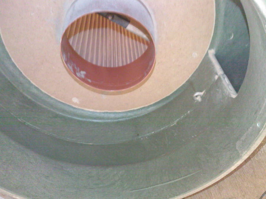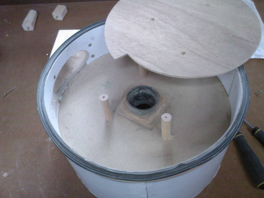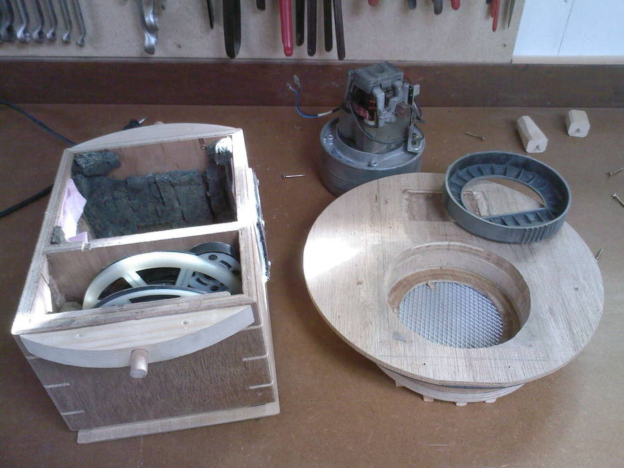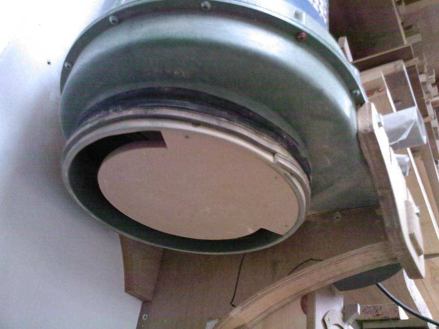 The rubber ring laying on top of the base plate is the original motor/fan ”seat”, with the one modification that a couple of ”ears” were cut off. The dug out in the base plate (behind the hole for the motor) is to allow room for the cable reel. This could have been avoided by better planning (motor/fan sunk slightly less deep into the filter chamber, and a slightly higher enclosure), but that’s what happens when one starts off without a properly detailed drawing. I mentioned previously that the thing is very quiet, and the reason for this is to be found in the construction of the motor/fan unit. Most/many shop-vacs are made for wet/dry operation, which means the air from the fan cannot pass through the motor, and allowance must be made for any water that may enter the fan to be led away relatively easily, thus leaving noise reduction (more or less) to the plastic housing. Not so on a domestic vacuum. The worst that can happen is that dust gets pulled through the motor, which it might even be tolerated if it's only small particles (hence the secondary filter). With that restriction gone the motor and fan casing can be made to act as an effective noise reduction. On the shop-vac, which handles a relative small amount of air at relative high differential pressure, the ring housing the filter and cyclone chambers, has a diameter of about 30 cm, the cyclone chamber a height of about 6 cm, and the pipe stud to the filter has a diameter of about 5 cm and protrudes about 2.5 cm into the cyclone chamber. On the dust extractor, which handles much more air and mostly much larger particles, the diameter of the ”cyclone chamber” is 26/32 cm (varies due to the offset inlet which adds positively to the cyclone effect), with the outlet to the bag, and thus the Thien baffle, being only 26 cm in diameter. The height of the chamber is about 12 cm, the inlet to the filter also about 12 cm and protruding about 6 cm into the chamber.