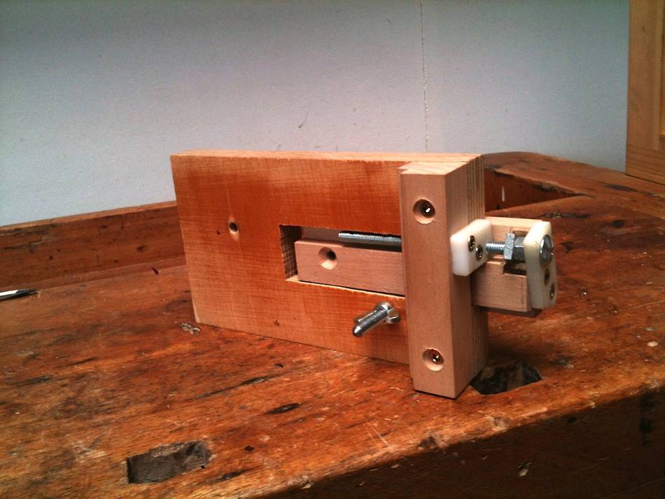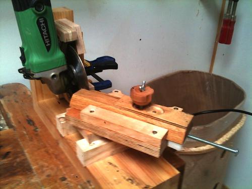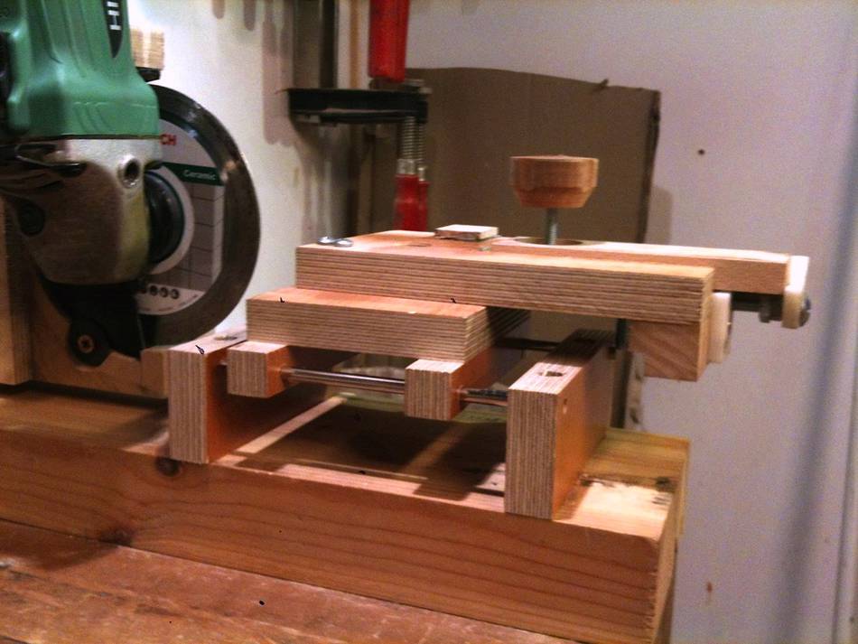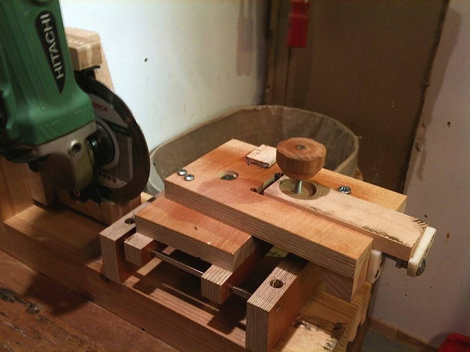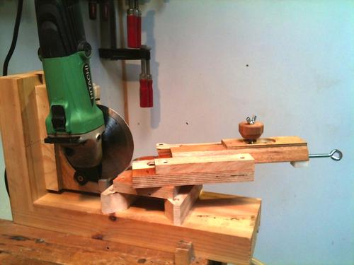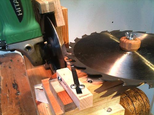 On the first set-up there are in fact two sleds, one formed by the two steel rods, for moving the blade to an from the cutting disk, and one, a block of wood running in a slot in the arm for adjusting for blade size and position re the cutting disk. It worked very well, but the pivot point for the arm wasn’t quite right, and as it was all an experiment, I decided to try the other way.