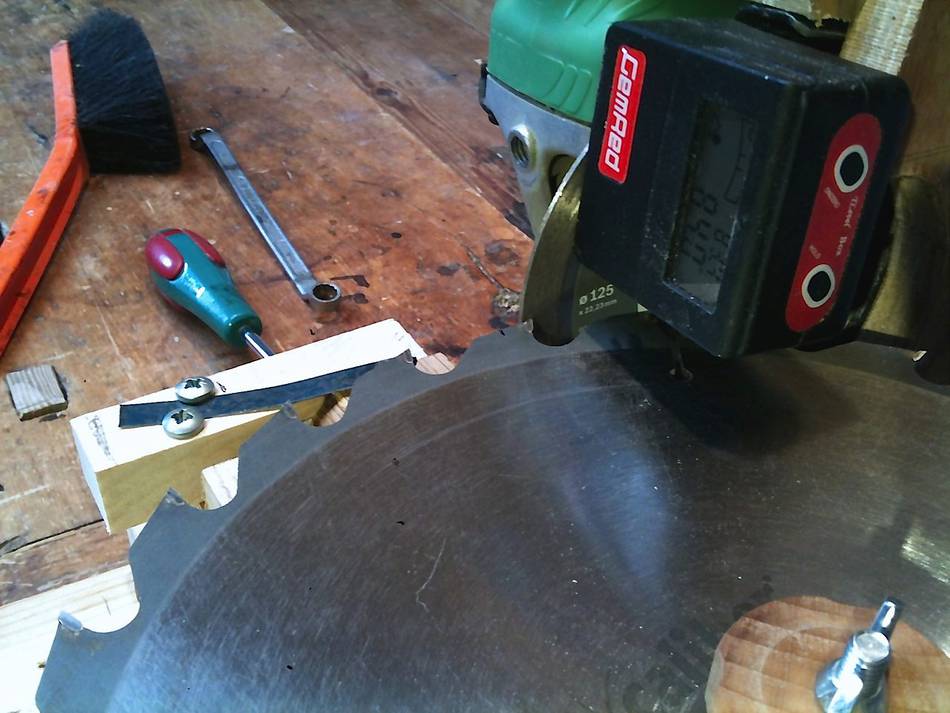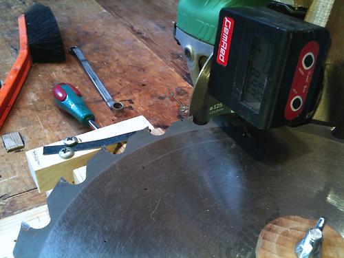 Hallo Matthias I saw your experiment with a saw blade grinder set-up some weeks ago, and it inspired me to have a go at it too. Machines for that purpose available here are either too expensive or too “hobbyist”, and having blades redone professionally just doesn’t pay, so I’ve ended up with a number of worn-out and/or spoiled blades. I didn't have a suitable motor available, and didn't want to invest in one, so using the angle grinder with fine ceramic cutting disk was the best I could think of for the “business end”. And it works very well, except that the disk I used is a bit too coarse, leaving slight “scratch marks”.