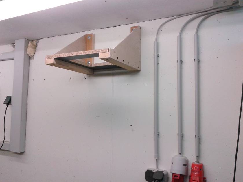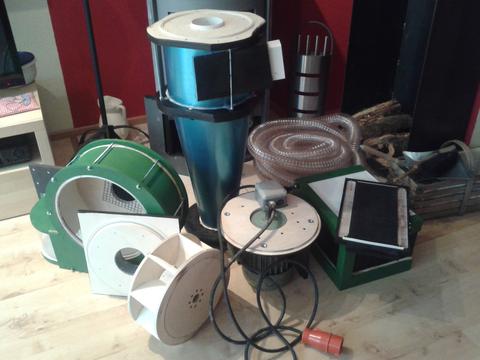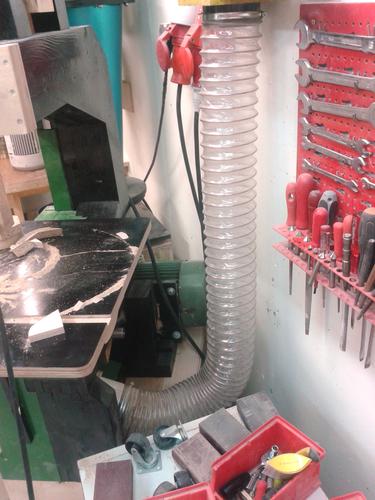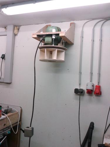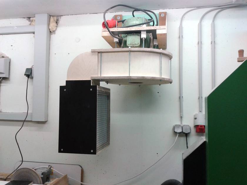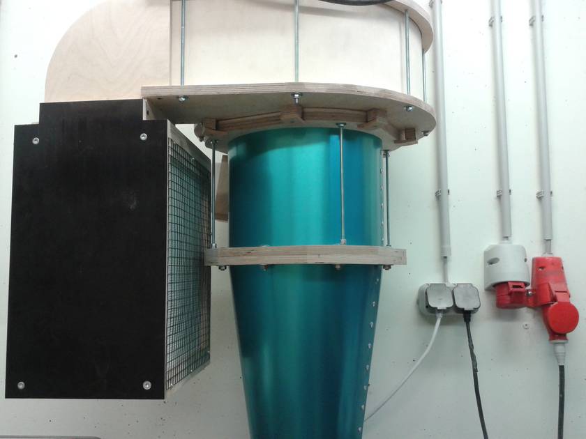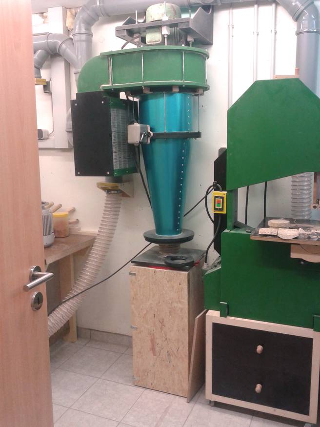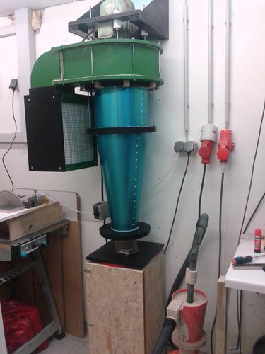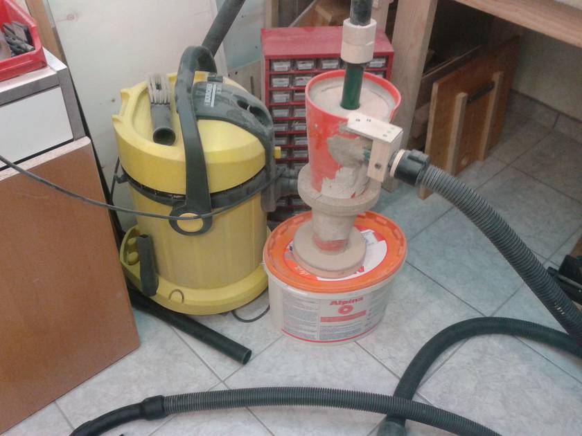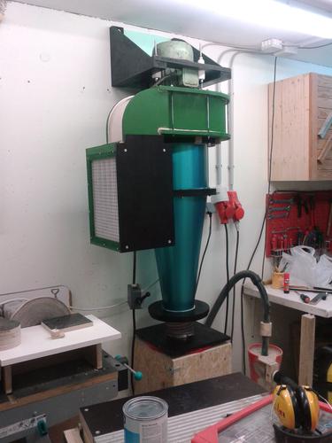 There is also a piece of felt and wire frame in front of the filters to protect them a little bit from impacts. There is also a piece of wire frame over the whole between blower and cyclone to protect the rotor from bigger stuff that might pass the cyclone. (no problems so far) The 90° angle is made with Plexiglas to give me a view inside the filter box. The whole thing is connected to the blower and it all hangs from the wall. The cyclone is also attached to the blower with some wooden clips.
