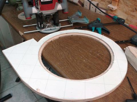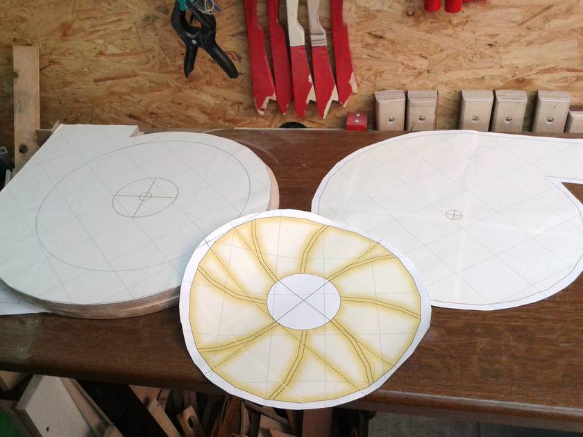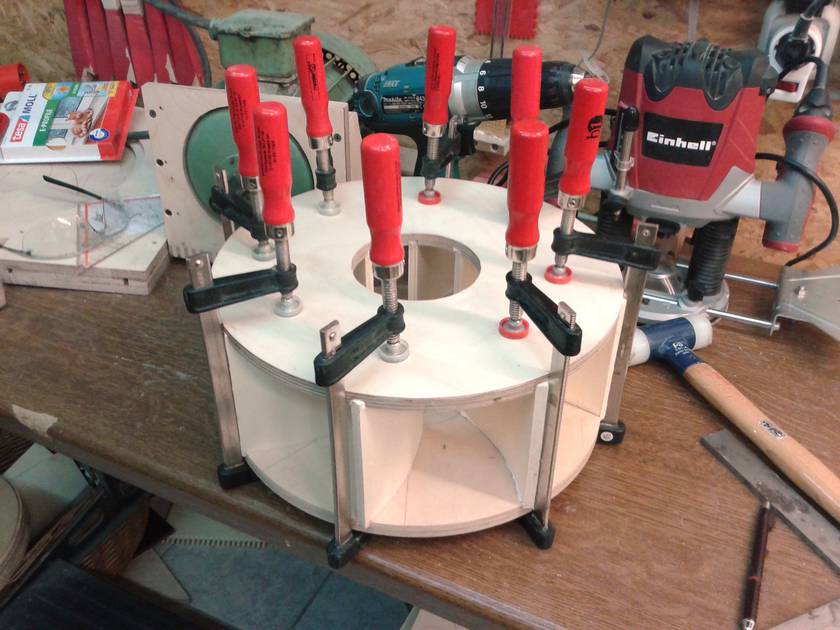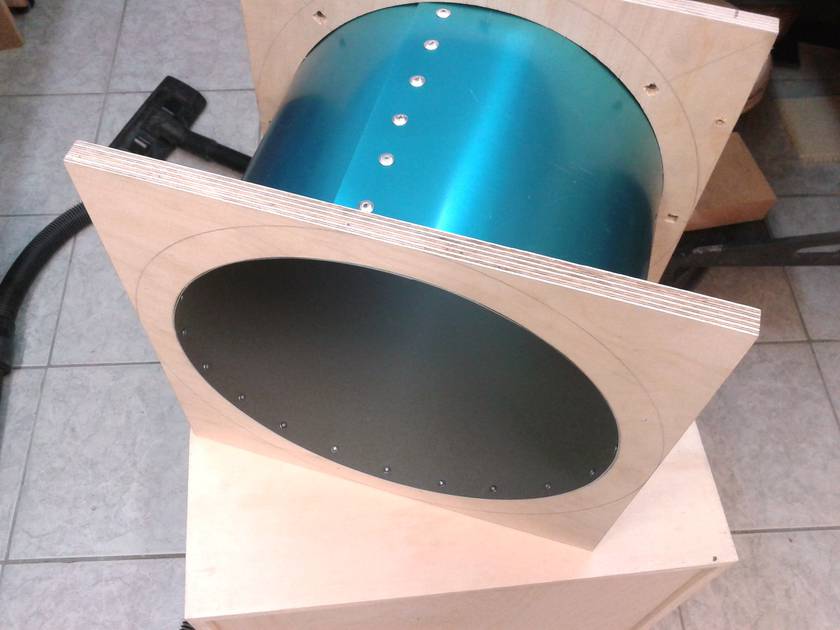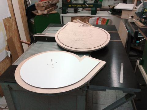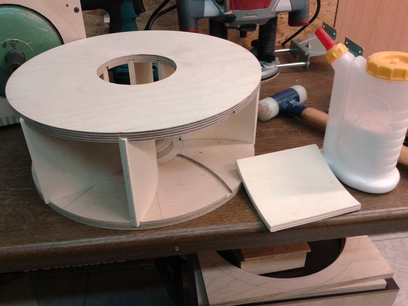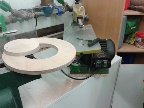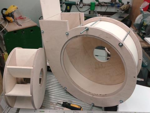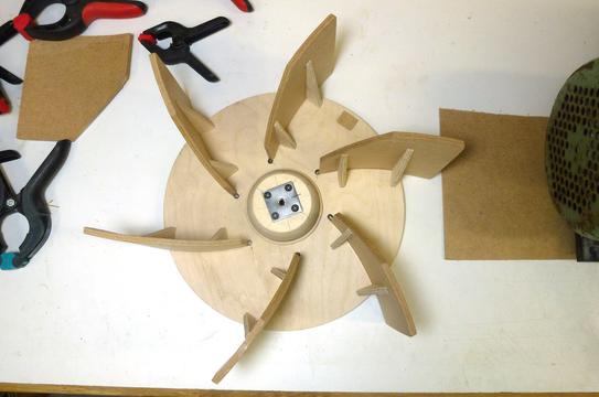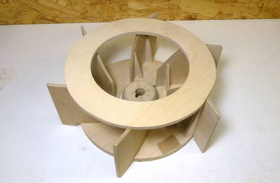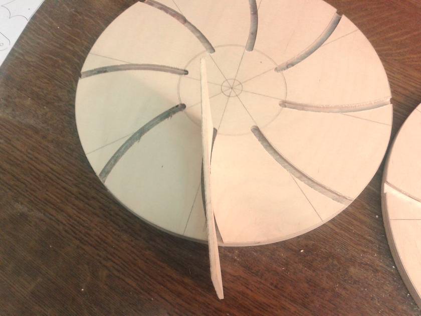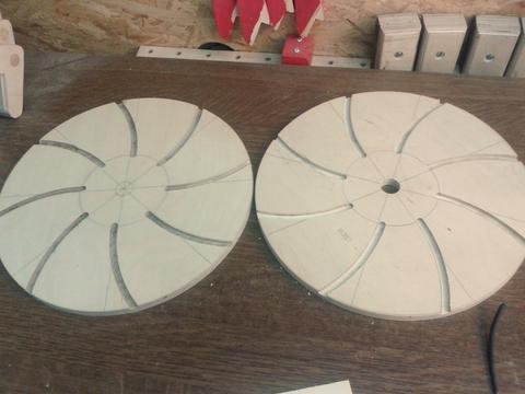 it. Two 32cm diameter birch plywood disks with 8 8mm backward curved
