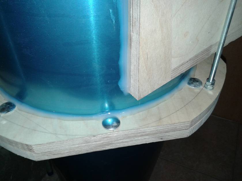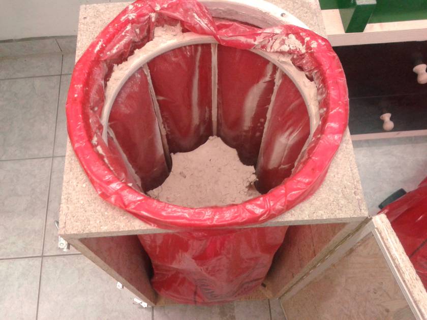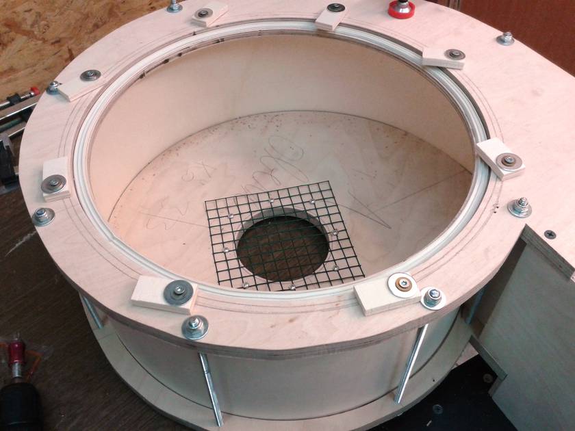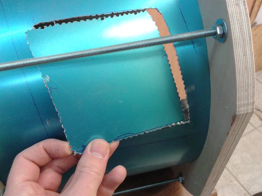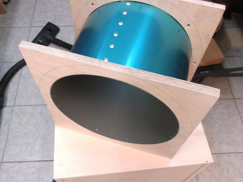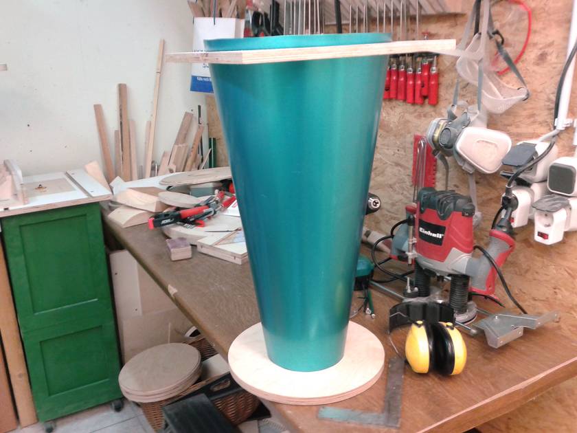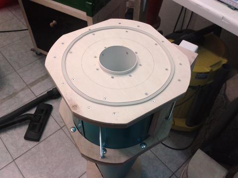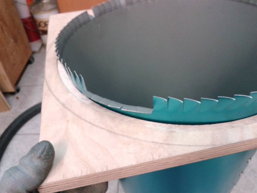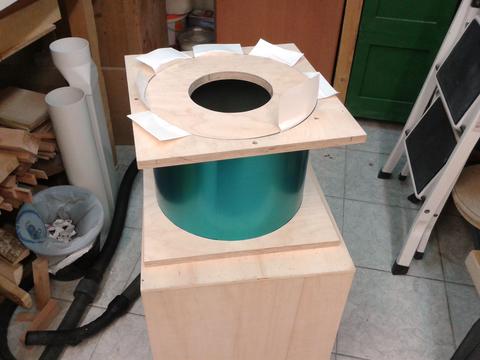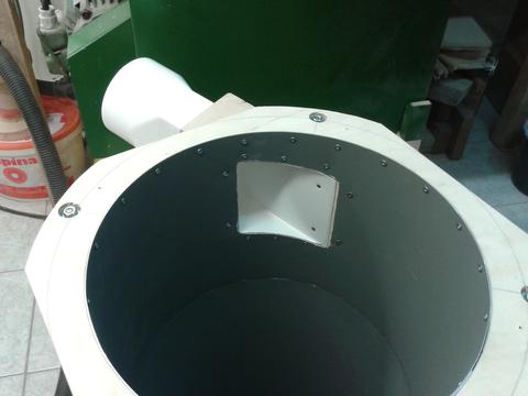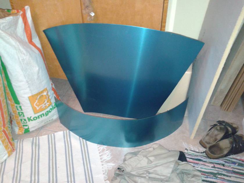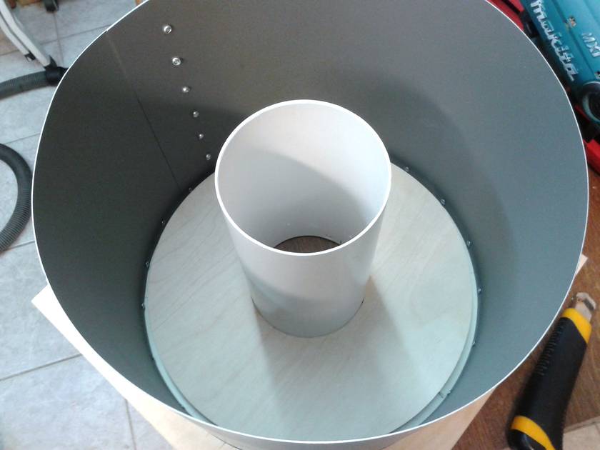 I bought the right size sheet of 0.6mm aluminum and cut it to the final shape. The assembly of the cone section was difficult and there was no time for taking a picture even with the help of my dad. But it came out really nice. It has the same size and shape as Ryzsard's. Top (cylindrical) section: 300 mm diameter, 235 mm high. Outlet: 110 mm diameter, protruding 208 mm from top. Cone: 576 mm high, 145 mm at bottom. Connection to collection bucket: 120 mm diameter. Total height of cyclone: 897 mm.