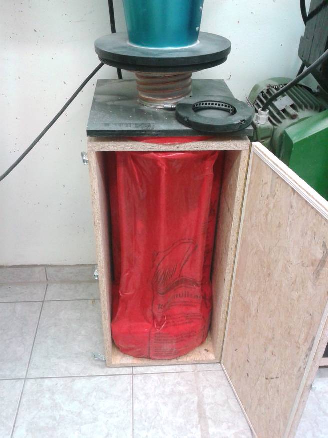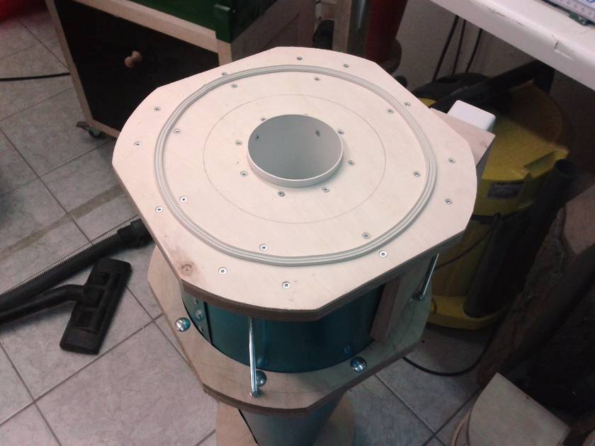 And at last I added a hose to connect the outside of the collection chamber with the cyclone, so that there is vacuum around the bag as wellto prevent it from being deflated by the suction. Unfortunately it didn't work as well as I expected, but I also didn't want to spend more time on it, because I needed the dust collector working again.
