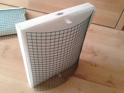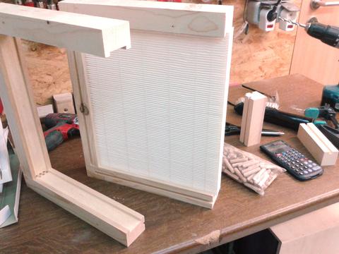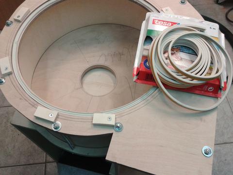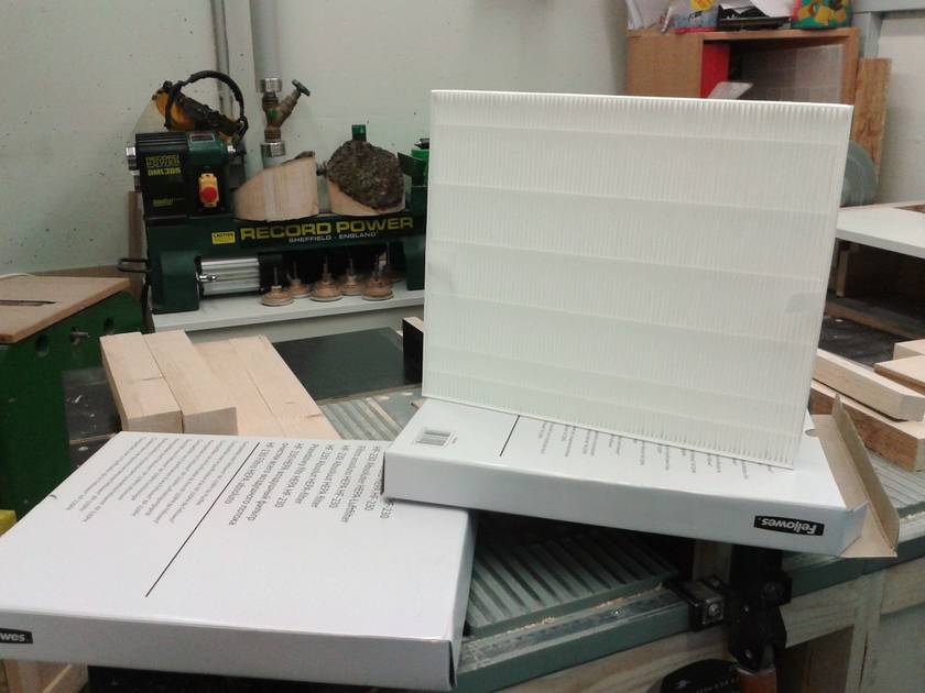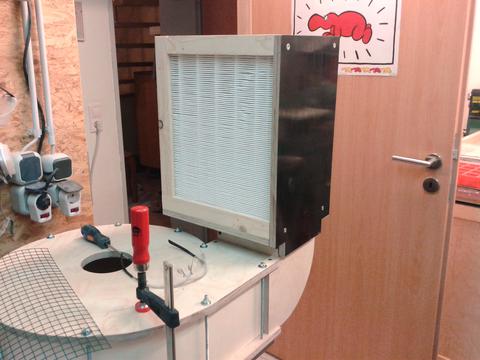 For the filters I used 2 Fellowes HEPA filters. 28cm x 33cm x 3cm, which are normally used in a commercial air cleaner. They are rated with 0.3 micron and 50€ for both was quite a good deal. I made a box for them with C-shaped frames to be able to remove them for cleaning or replacing.