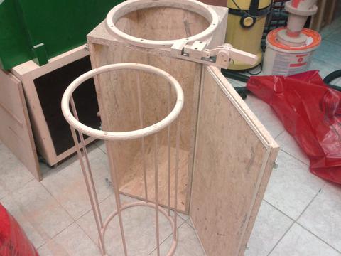 Then I made a wooden dust bin out of some sanded OSB. It is the perfect size to fit a standard 80 liter plastic trash bag. You have to pay 2.50€ per bag but this covers the garbage collection fee. To prevent the bag from being sucked up into the cyclone I designed a special low profile toggle clamp. It worked, but the bag was still sucked empty and the dust couldn't fall into it. So I made something to hold the bag open and it works great.. But unfortunately I now have no use for the nice little clamp I made. What's really nice about this homemade dust bin is that it's really easy to empty it and change the bag.