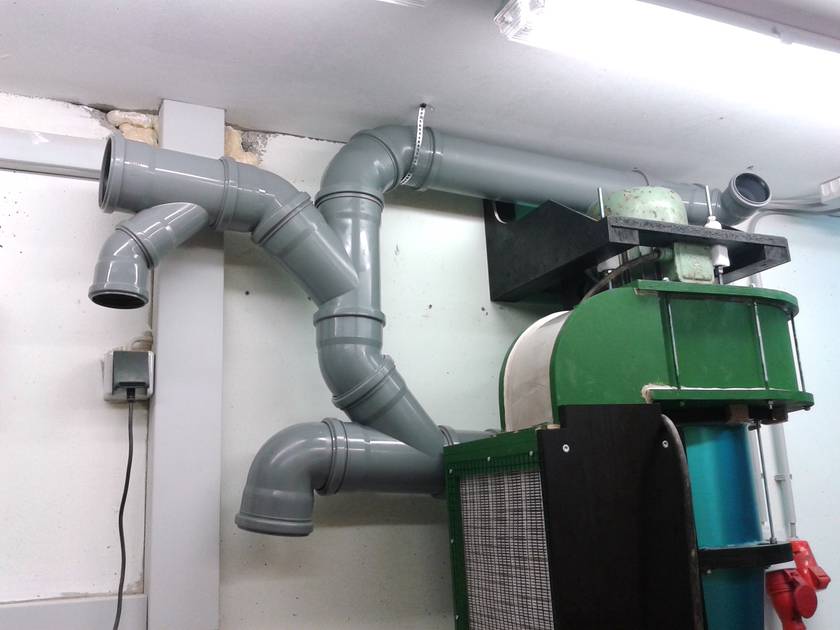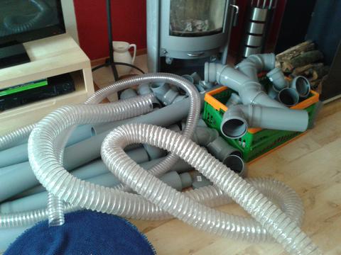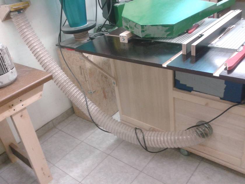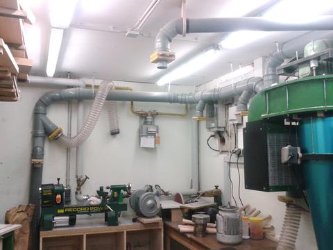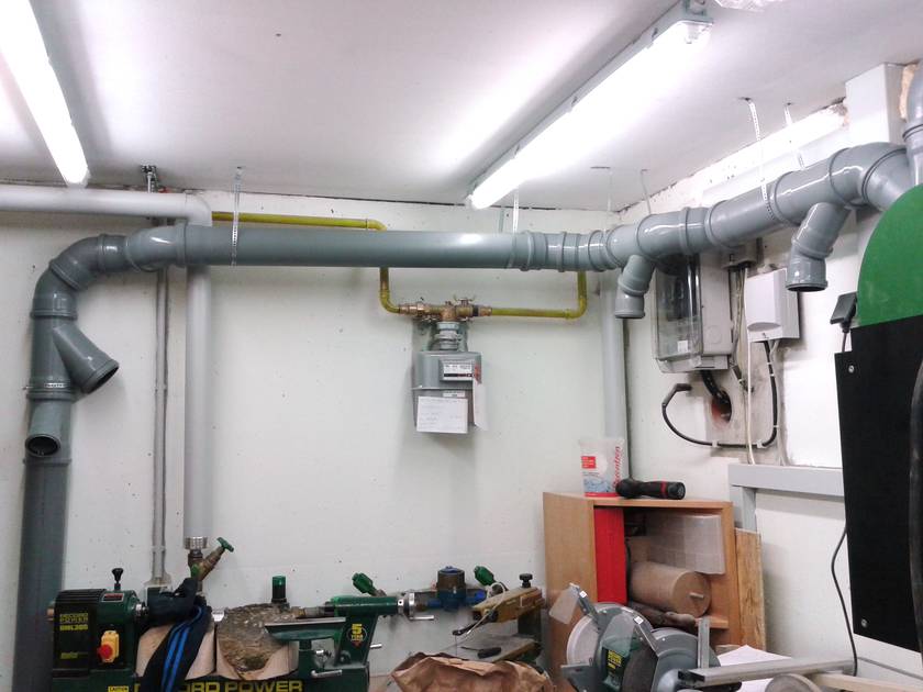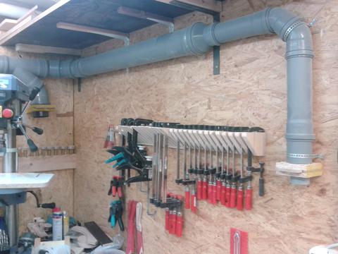 After that it was time for plumbing. Because my shop is very small that was a bit tricky. Now I have five 100mm connections for the table saw, bandsaw, drill press, a future floor sweep near the lathe and a movable hose for the lathe and the homemade drum sander. And five 60mm connections for the scrollsaw, a future guard over the tablesaw, a future homemade disk / belt sander, the router table and one to vacuum the floor or for handheld power tools. Everything has it's own homemade blast gate, which work just fine. So now every dusty tool is connected to the dust collector, still movable, but no hose or pipe lies on the floor.