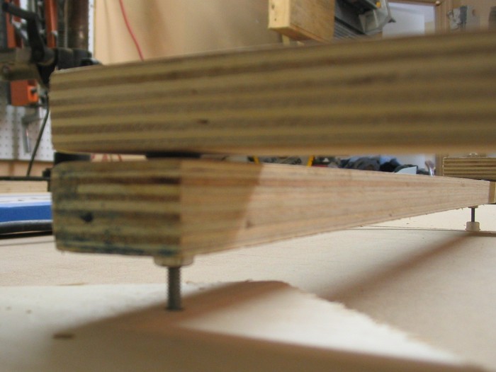 size of the routed letters. These guide rails adjustments are capped with 1/2" plywood and they pivot on