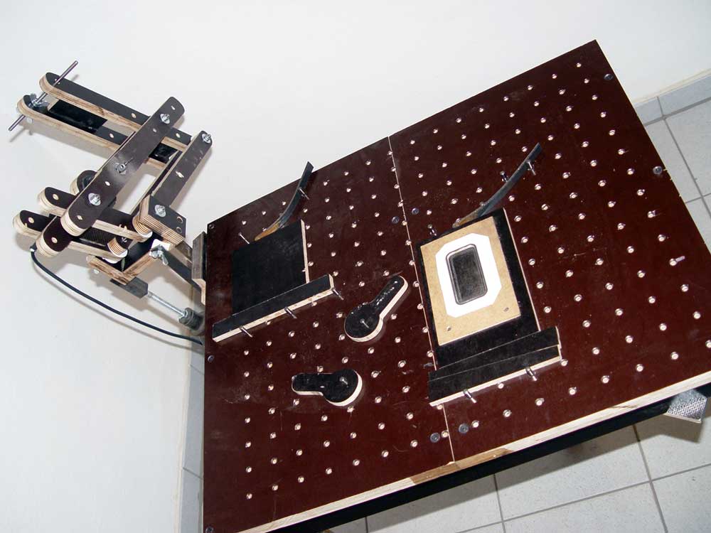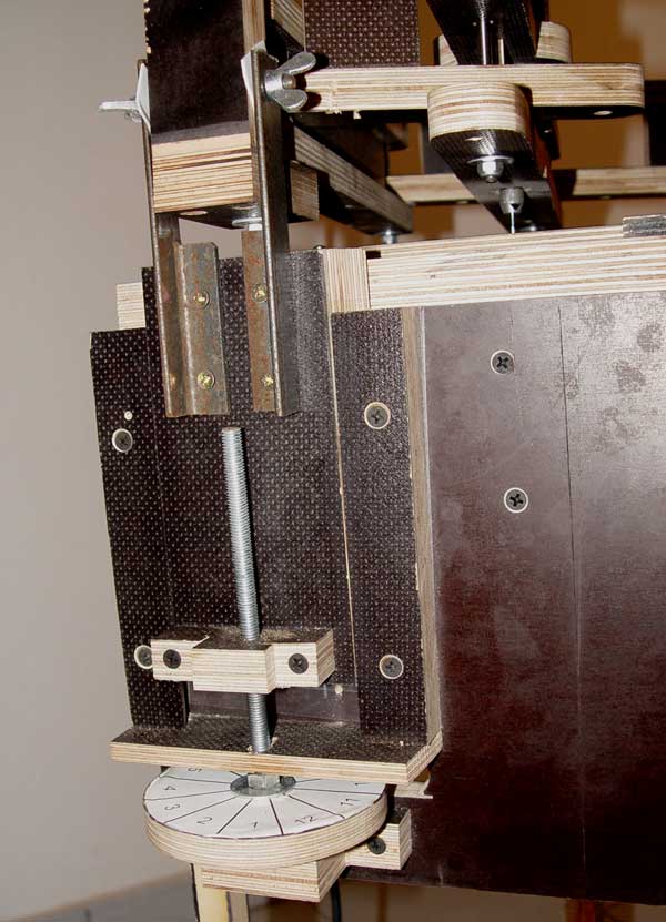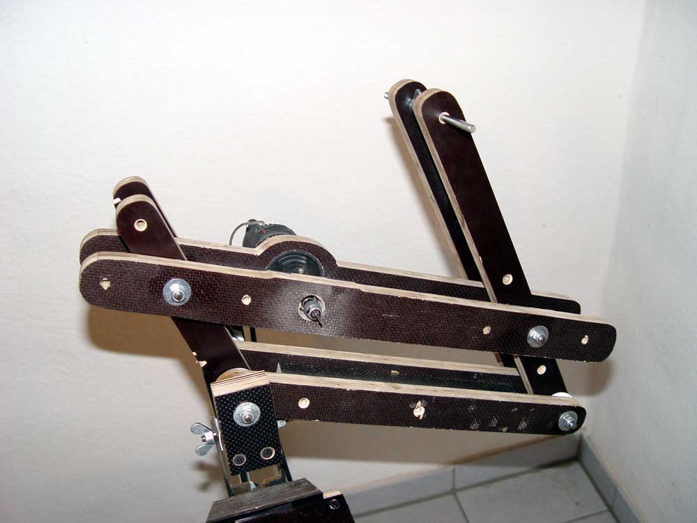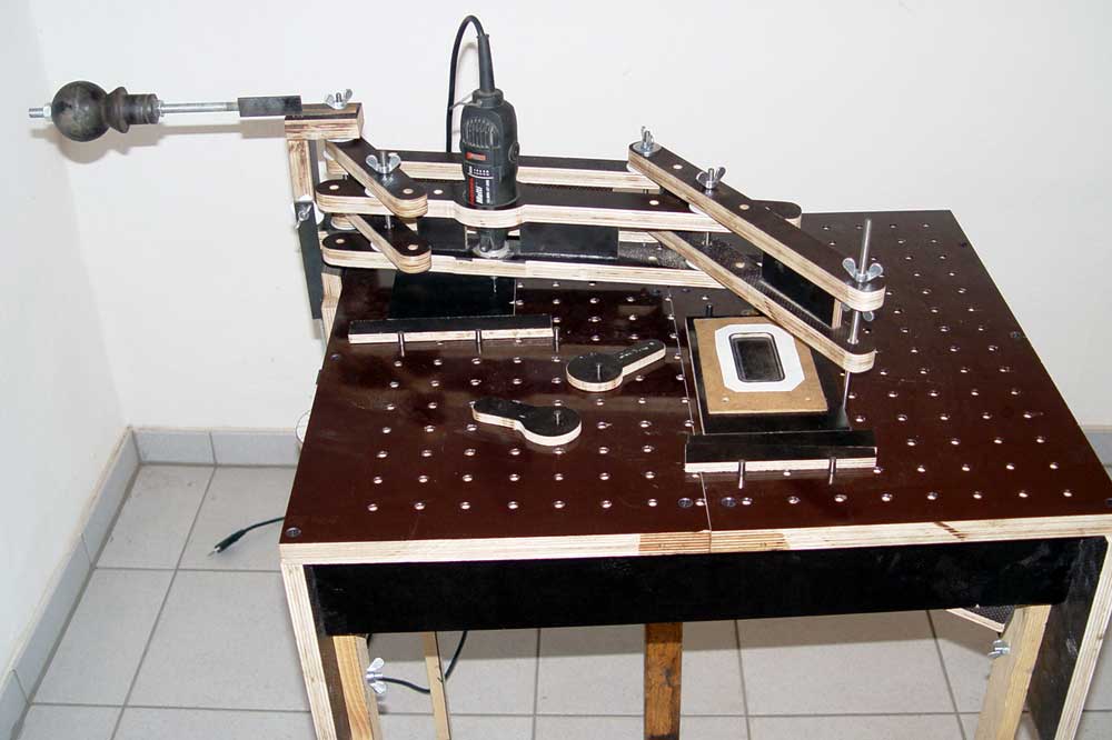 Dear Mr. Wandel, I wanted to thank you for putting all this great stuff on your website! I was Inspired by this to build a Pantograph of my own design and it works great! Added a Table to make clamping and positioning the workpieces and templates easier. I also integrated a height adjusting mechanism for the Pantograph arm. Some Teflon Washers between the arms make the movement even slicker :-) The Dremel is fixed by gluing a threaded adapter ring into the motor bar so I can easily remove it without tools for other projects. If I had put the motor bar on top like you did, the Dremel bits would have been too short to reach the workpiece. The stylus is also only partly threaded, with the two wing nuts I can incrementally pull it upwards or downwards and then fix the position with the second wing nut. I added a counterweight to the arm. This I found to be a really worthwhile addition because it removes all pressure from the stylus making it even smoother to operate and also removes all of the residual minimal play I had when lifting the stylus. The play did not come from play at any of the pivot points and was there even if I tightened the rig until it didn't move. It was really minimal (less than half a mm) but nevertheless noticeable. Now, when I lift the stylus a mm the Dremel bit is lifted exactly half a mm.