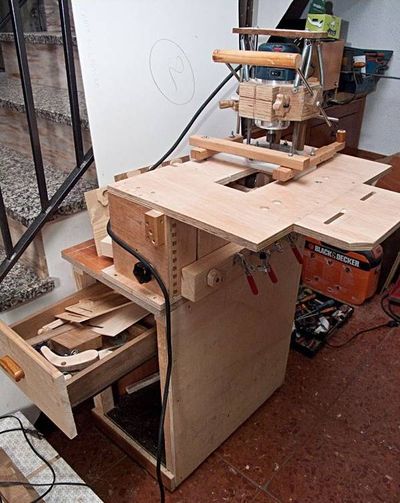 The problem with normal plunge bases is that two hands are needed to operate them. Also, the old base didn't allow for a deep enough plunge through the work table. The hardest part was ensuring that the router was always perpendicular to the work table. This was solved by making the router mount slide on two 60mm long bronze bushings.