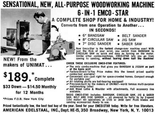 The "Emco-star" is a combination machine that can work as a 6" bandsaw, 8" table saw, disk sander, scroll saw, jigsaw, belt sander, lathe, shaper, bench grinder and horizontal drill.