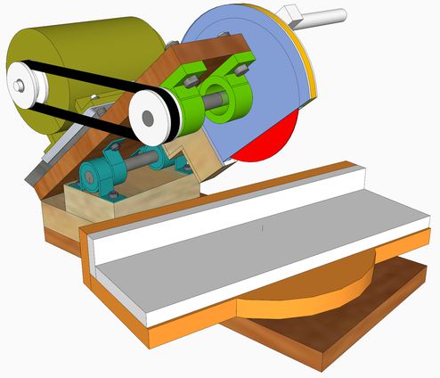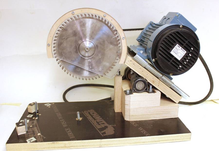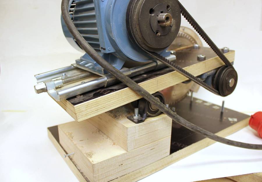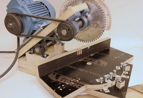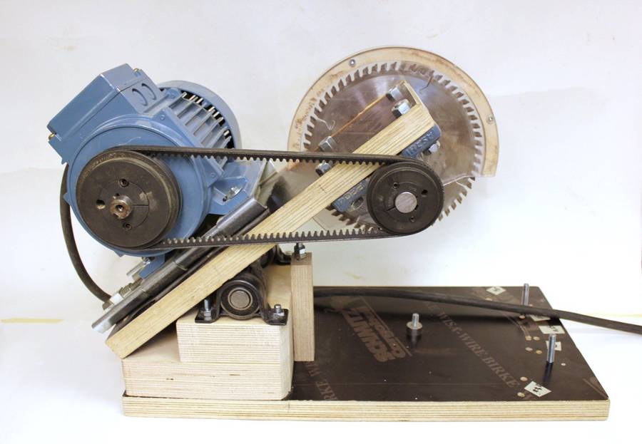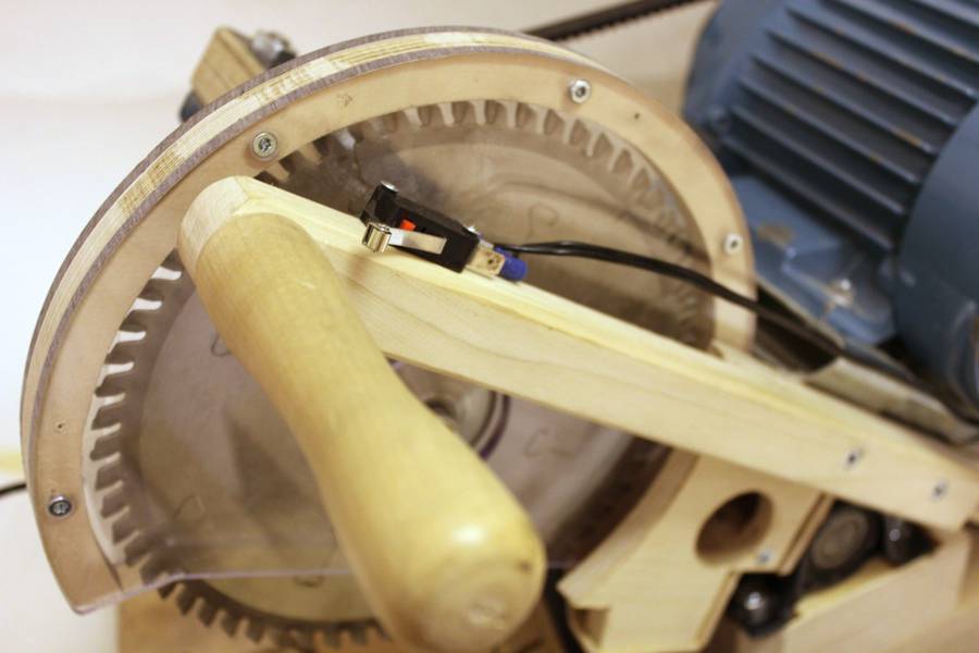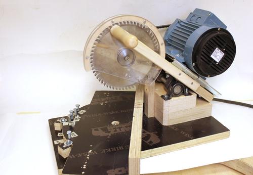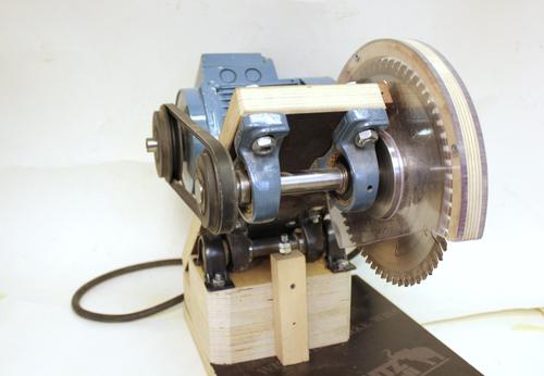 The motor is installed on a standard motor mount plate. Belt tension can be adjusted with a setscrew. The motor is a 3-phase motor driven by an inverter and its speed can be adjusted. On the handle is a micro switch, pressing it with the fingers starts the motor and when it's released the motor stops. The motor must be stopped after each cut so the spinning blade will not contact the just cut piece when lifted back up.