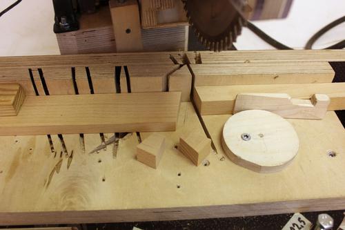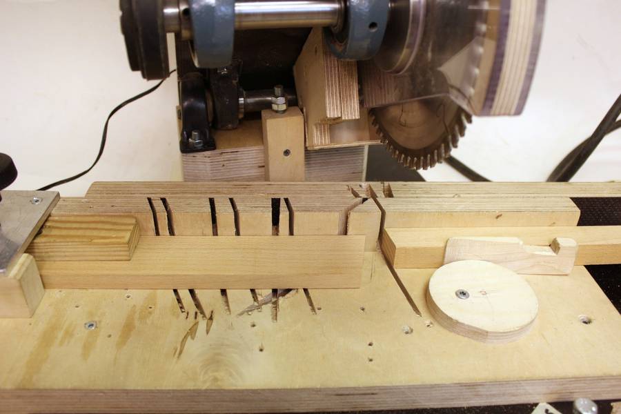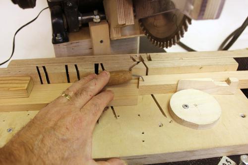 When starting to make segments, the first cut is made, then the length stop is locked. The work piece is then flipped over and clamped against the fence and stop block with a wedge between the wood and an off-centre disk.