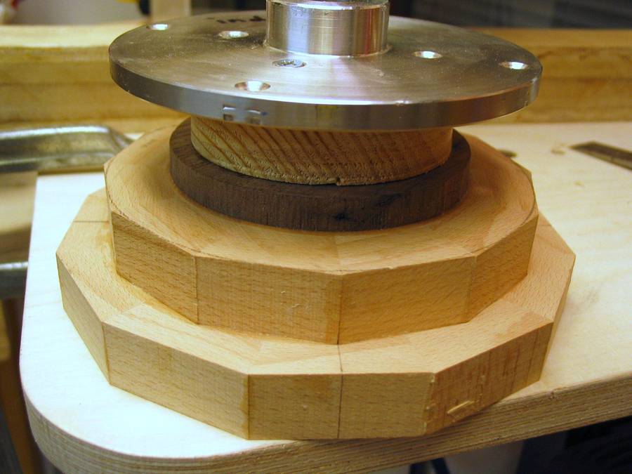 a solid wood disk on a lathe face plate. Then the next ring is glued to the first ring,
