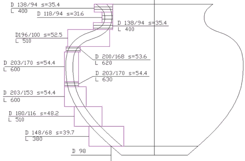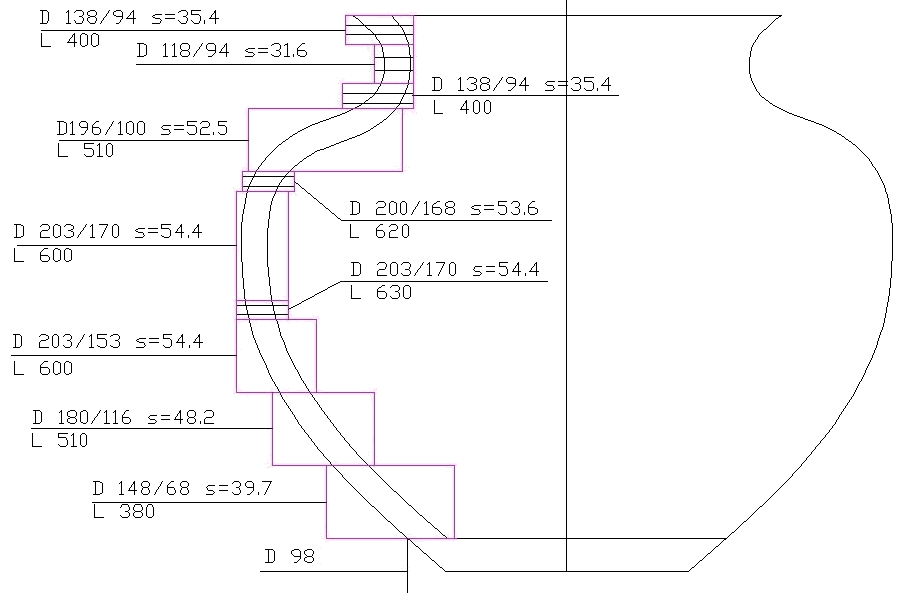 First I draw the shape with intended wall thickness, 5 or 6 mm. Then ring diameters are drawn with some margin for roundness and position errors. The segments lengths are calculated from the drawing.