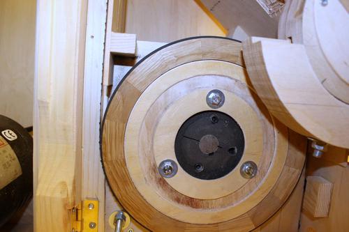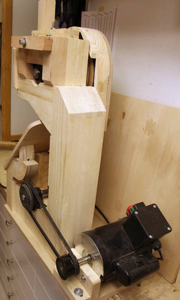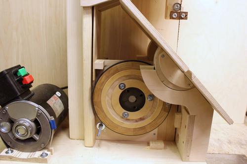 This saw is based on Matthias's saws, scaled to smaller size. I took some ideas from both of his recent saws. The saw has 220 mm wheels (8.5") and the cutting height is 170 mm. The motor is from my lathe, which now has a 3-phase motor.