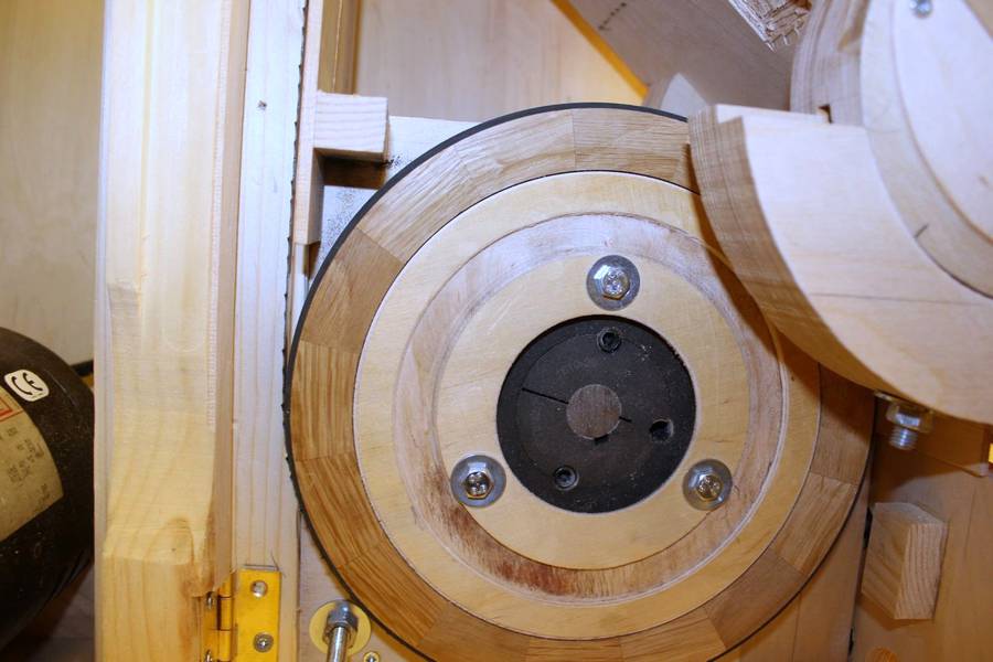 For the wheels I glued oak segments to the edge of a 18 mm plywood wheel.