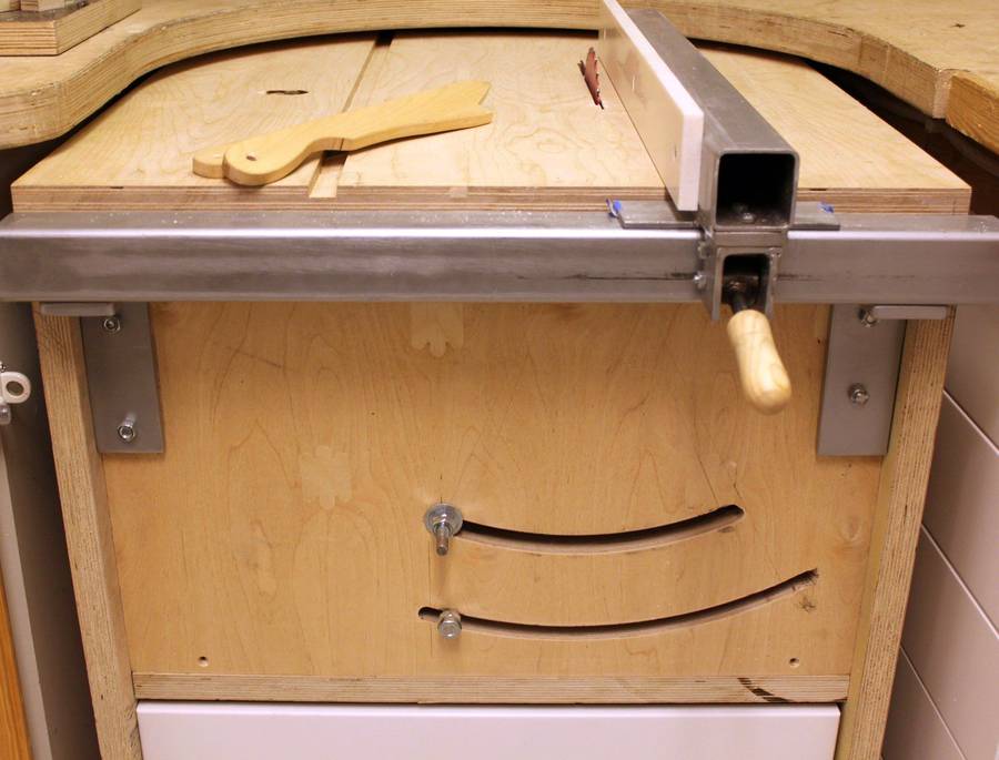 The rip fence is made of 50 mm steel tubing with the sliding surface made of Corian.