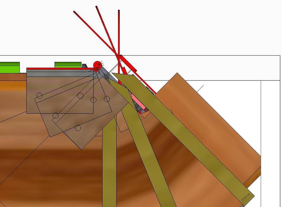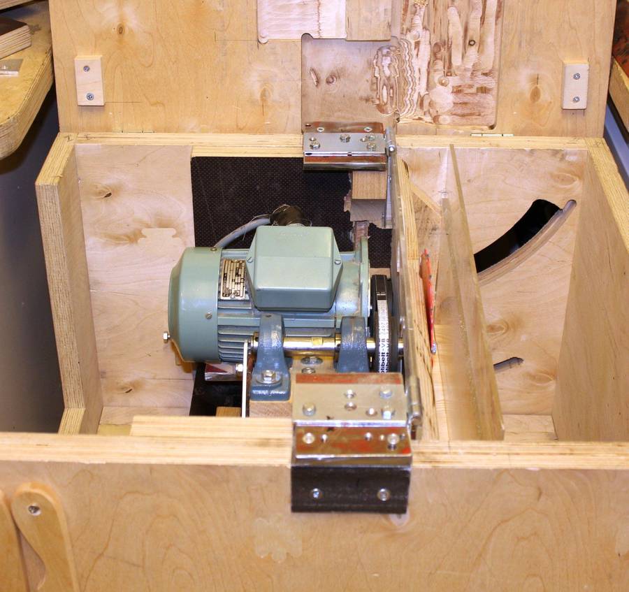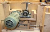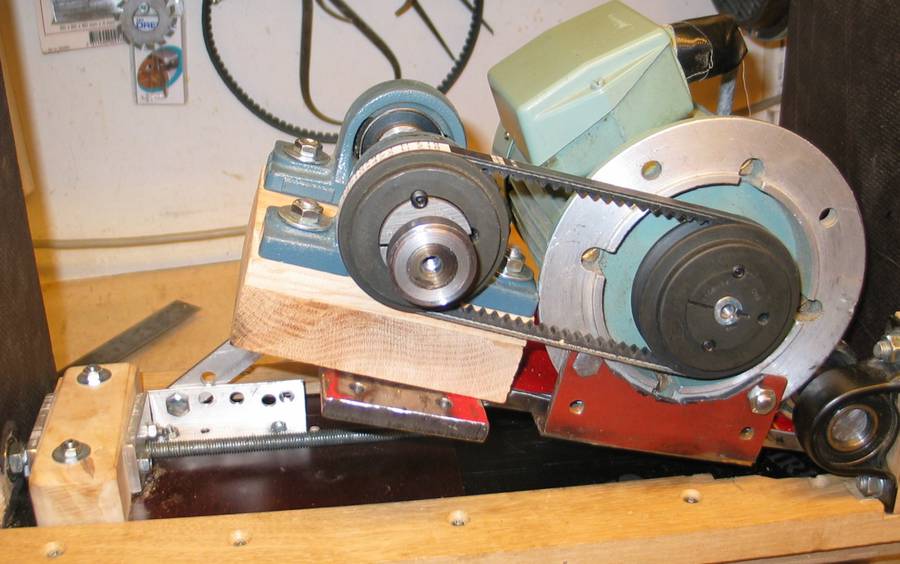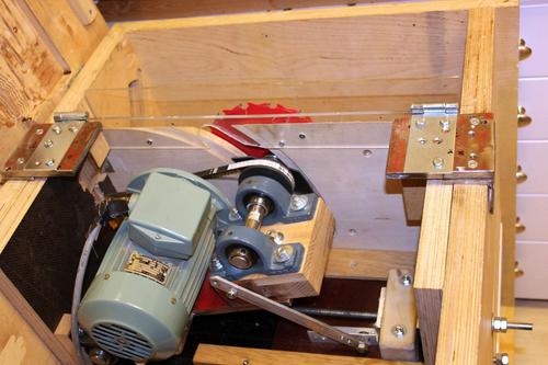 The plate that mounts the motor and arbour can be tilted around a shaft with two pairs of bearings. The plate (red) is made of 10 mm thick steel. The arbour bearings are installed on a wooden block to raise them up further to get the arbour closer to the table. The motor is a 3-phase motor driven with an inverter.