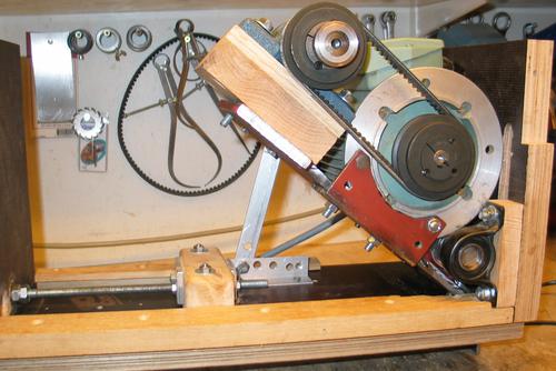 My motor is installed so that the belt is just behind the blade. I get more room for tilting with this design. The belt pulleys are standard wheels with a tapered collet to lock on the shaft. They are surprisingly cheap.