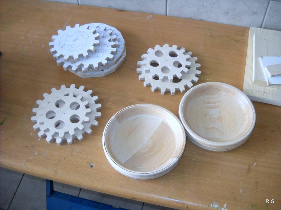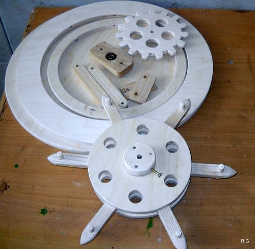 The gears are designed on the free online gear template generator and cut out with my homemade bandsaw