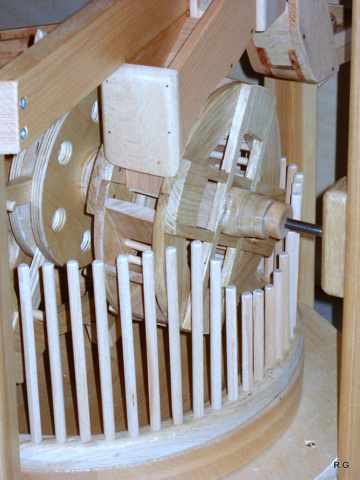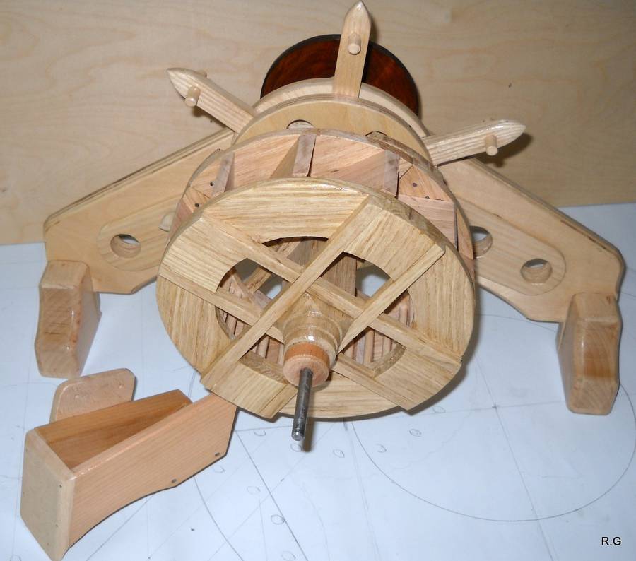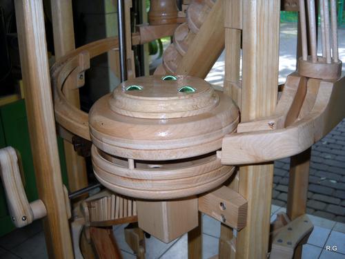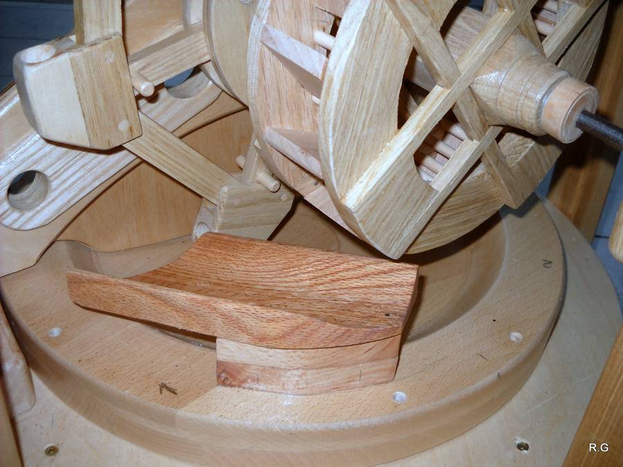 The lower water wheel is modeled on the historical wheel of the museum (which drives a hammer mill). It has a mechanism to prevent it from turning backwards.