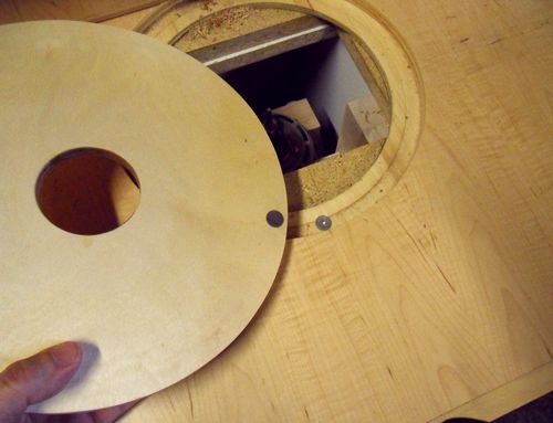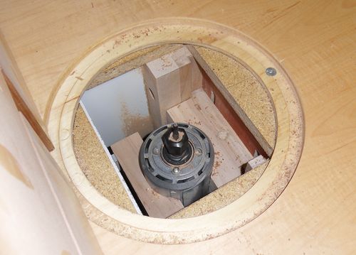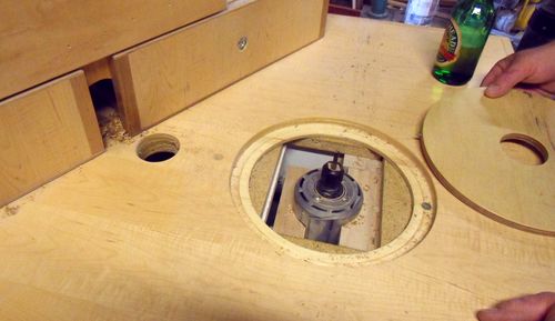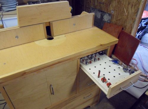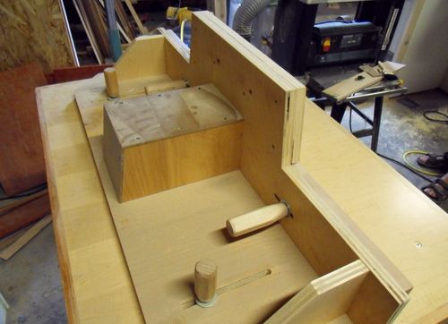 John Heisz's router table![]() Recently, one of my trips took me past John Heisz's home. I was eager to see his homemade table saw in person, so I took a slight detour to have a look. John also showed me his homemade router table. The router table incorporates a built in router lift, inspired by the design of my router lift. Specifically, the arrangement of the right angle gearing and threaded rod to raise the router up and down.