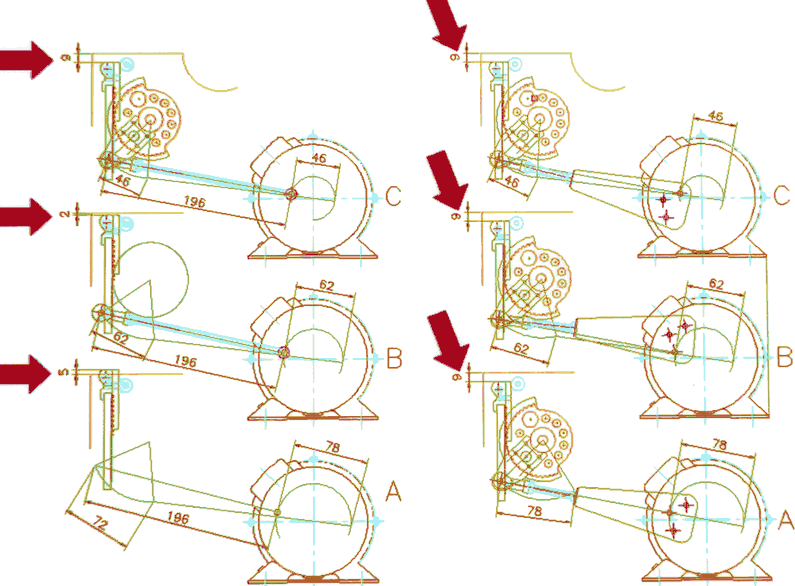 Different holes in the connecting rod are used for different motor crank radii so that the top of the blade's stroke is always in the same position. (click image to enlarge)