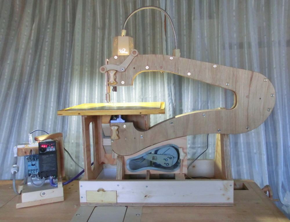 This scrollsaw uses 0.2kw three phase motor, driven by an inverter running off 60V 100V signgle phase.