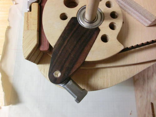 A connecting rod connects to this lever to rotate the bottom pulley back and forth to drive the saw.