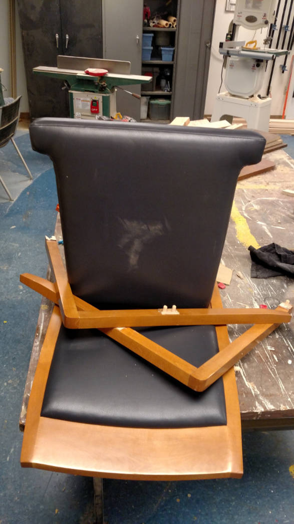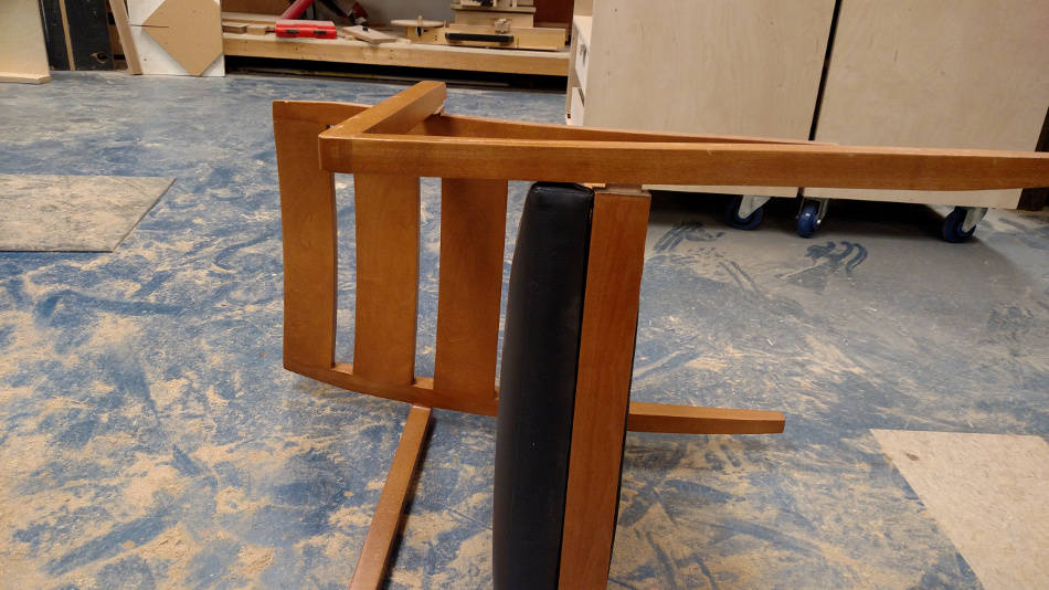 Repairing chairsWe normally get about four chairs each week in for repair. The problem with these chairs is that they are put together with dowels. This design may have worked OK in a situation where they would receive light use, but when subjected to the public on a daily basis they just don't hold up.