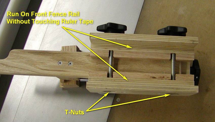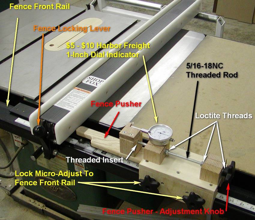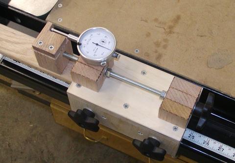 Ronald Walters writes about his fence micro adjuster: "The problem when trying to adjust the table saw fence… the far end of the fence swings back and forth in relation to the front locking end of the fence when the locking lever is released and you try to move the fence to a new setting (while visually using the ruler tape on the Front Fence Rail). This makes it very difficult to make small adjustments in the fence settings because once the Fence Locking Lever is released; you immediately lose your mechanical point of reference. Thus, you are repeatedly unlocking - adjusting - locking etc., until you hope you have achieved the desired setting. Then you make a cut and hope for the best. The fence locking mechanism is a T-Square arrangement. Once the Fence Locking Lever is released, there is nothing there to keep the fence square to the table saw. Once the Fence Locking Lever is again locked, then everything is once again square with the table saw. I wanted a mechanism, that would clamp to the front fence rail and would allow for incrementally small changes in fence position (a few thousandths of an inch at a time) to aid in "fine-tuning" the position of the fence. It is difficult to come up with a removable mechanism, which will push & pull the fence. My Micro-Adjust essentially becomes the "new mechanical point of reference" once the Fence Locking Lever is released. Assume the fence is initially set to the desired position. You make a cut with the table saw and then you decide (discover) you would like to change (increase or reduce) the measurement a few thousandths of an inch. DO NOT release the Fence Locking Lever. Pre-Load the dial indicator to .500 inch (mid-range point on the dial indicator). This mid-range point allows for ˝ inch change in either direction. Begin turning the Fence Pusher Adjustment Knob in the desired direction of travel (to take up back-lash in the threads) and zero the dial. Slide the Micro-Adjust mechanism along the Front Fence Rail until the Fence Pusher is snugly against the backside of the table saw fence. Lock the Micro-Adjust to the Front Fence Rail using the two locking knobs. NOW you can release the Fence Locking Lever. Turn the Micro-Adjust Fence Pusher Adjustment Knob until you have the desired change in dimension. If the change in measurement is smaller, the pusher will move the fence closer to the saw blade. If the adjustment is for a larger dimension, a gap will result between the pusher and the backside of the fence. While gently holding some pressure on the fence to make certain the fence is against the Micro-Adjust pusher, lock the Fence Locking Lever. As with most woodworking, you will wish to make small changes in the fence position until you have the exact results. Will this allow you to make 0.001" adjustments? Probably not. However I have repeatedly adjusted cuts (with the use of a feather board) 0.002" to 0.004" and I expect with a bit of practice it could be better. I think this is pretty good considering the table saw and fence being used. The body of the Micro-Adjuster is made to be a snug fit on the front fence rail. The locking knobs just bend the wood slightly to grip the fence rail. The mechanical advantage of the 5/16-18NC thread is very powerful and there are two of them. This was a prototype to see if it would work. Obviously, this mechanism needs to be tailor-made to accommodate the fence on your particular table saw. Making a Micro-Adjuster with tighter joints and a fine thread rod would probably give better adjustments.