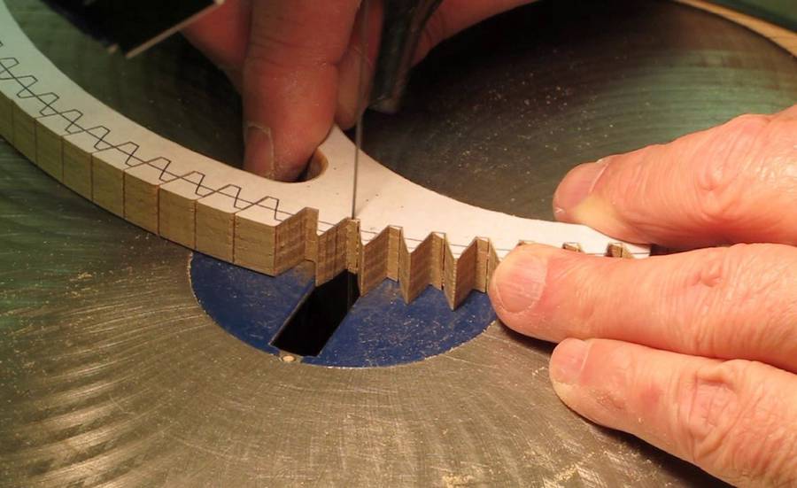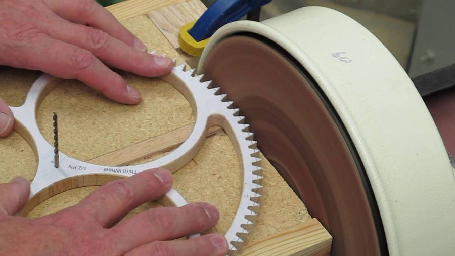 The particular wheels in this video are for the Solaris clock. They are the largest I have made at 12" to 14" diameter with 100 to 120 teeth each. I have considerable time invested just in the segmented blanks before starting to cut out the teeth. You don't want to be tired or distracted while cutting the teeth. If my back isn't bothering me too much I would expect to cut the teeth out for one wheel in a day, spread out over 2 or 3 episodes. Or, I may spread it out over two days. The filing would probably take another day. I use a large magnifying glass with a work light to have a good view of the saw blade and pattern. A mechanical gear doesn't always need to be so smooth but a clock wheel really needs to be a perfect as you can make it.