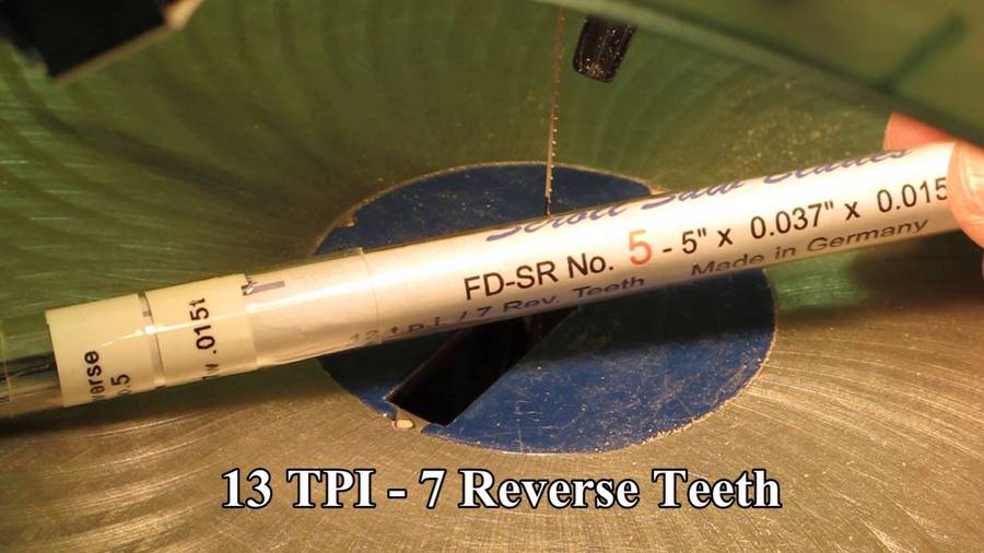 I use Flying Dutchman FD-SR No.5 - 5"long x 0.037"deep x 0.015" thick 13 TPI 7 Reverse Teeth scrollsaw blades, made in Germany